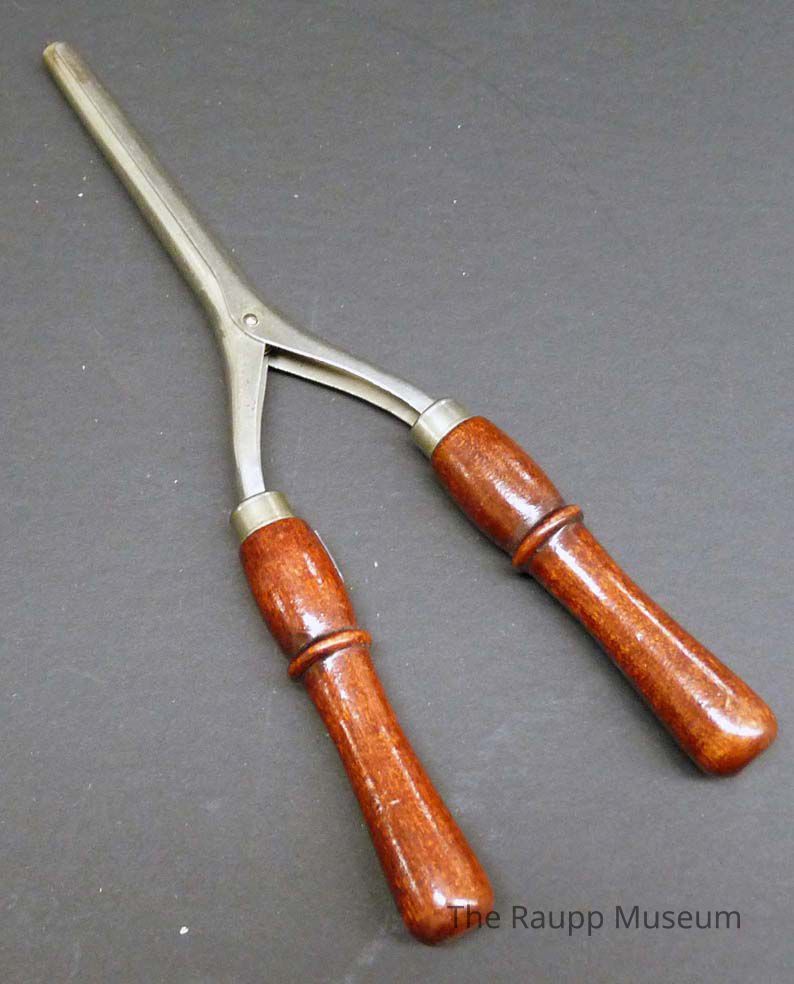 Early curing iron with hinged metal tongs and wooden handles. One tong is concave to fit around a narrow barrel. Tongs were heated on a rectangular burner with an alcohol or gas flame.