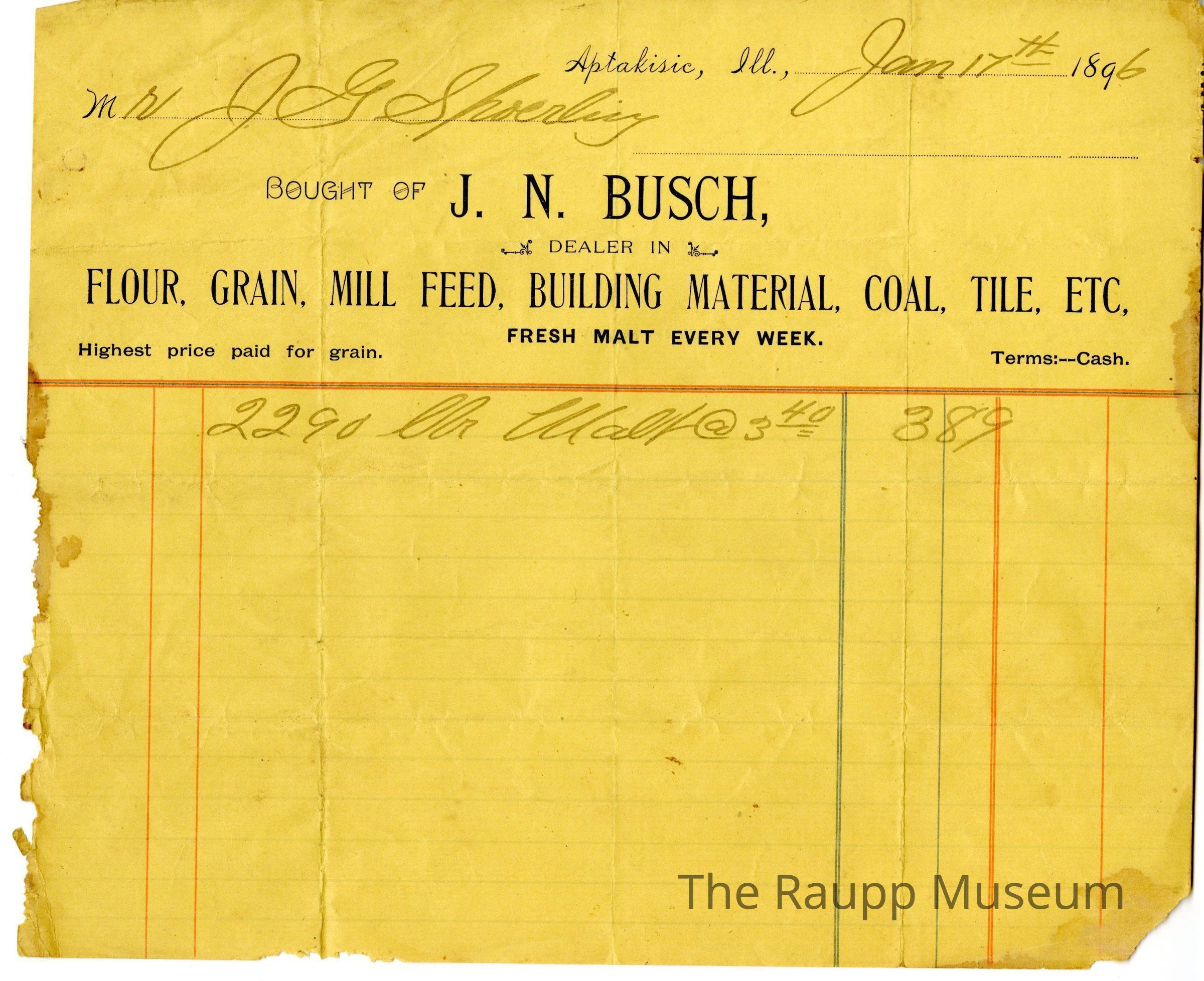 One (1) square yellow receipt for J.G. Spoerlein from J.N.Busch store. Printed along the top half is: "Aptakisic, ILL.,; Bought of J.N. Busch, Dealer in Flour, Grain, Mill Feed, Building Material, Coal, Tile, Etc; Fresh Malt Every Week; Highest price paid for grain, Terms: --Cash". Printed underneath the top label is red and blue lines for a space to write bought goods. Handwritten on the top is the date in the upper right corner: "Jan 17th 1896", and "Mr. J.G. Spoerlein." Handwritten in the receipt section is: "2290 Lbs. Malt @ 3.40, [total] 3.89."Archive Details