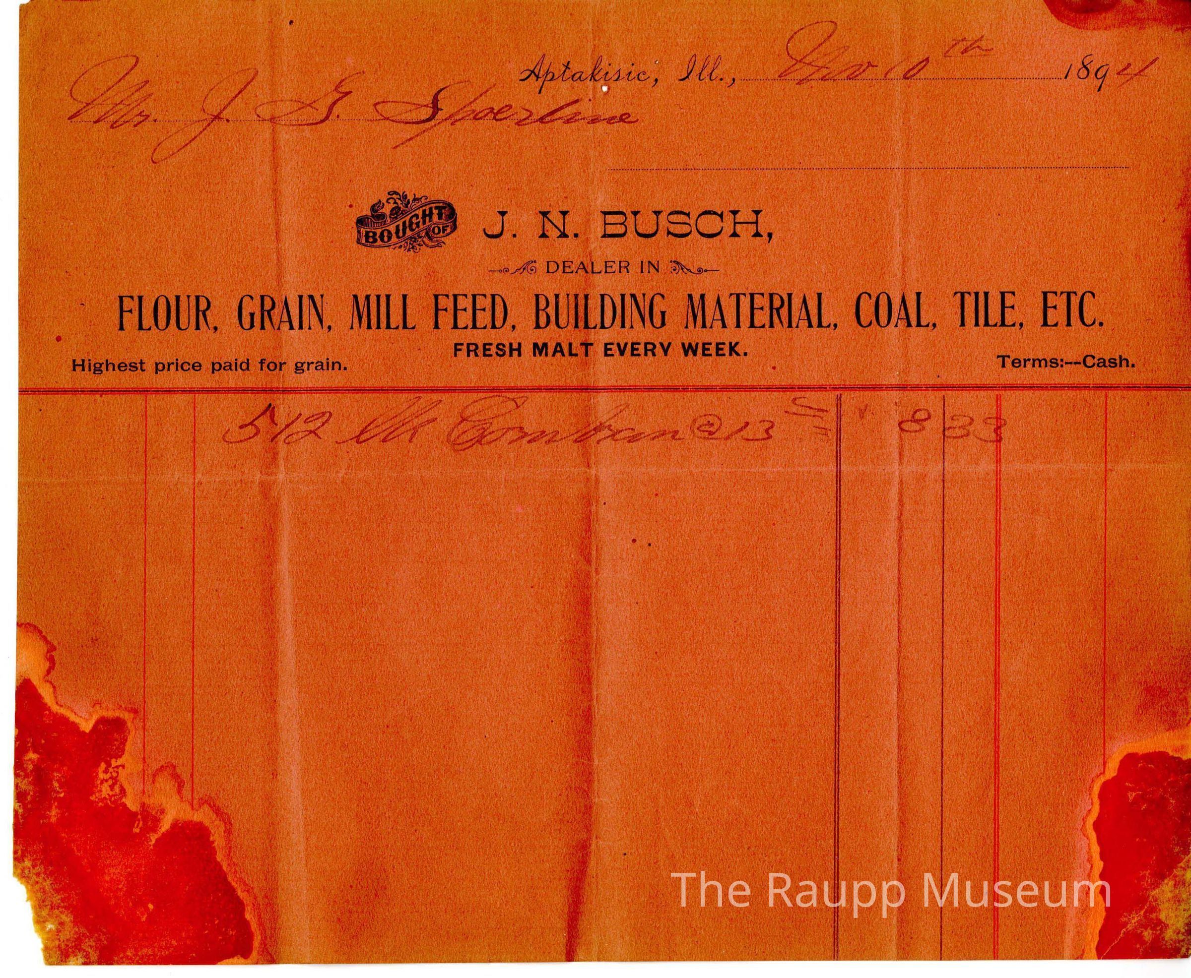 One (1) square red receipt for J.G. Spoerlein from J.N.Busch store. Printed along the top half is: "Aptakisic, ILL.,; Bought of J.N. Busch, Dealer in Flour, Grain, Mill Feed, Building Material, Coal, Tile, Etc; Fresh Malt Every Week; Highest price paid for grain, Terms: --Cash". Printed underneath the top label is red and blue lines for a space to write bought goods. Handwritten on the top is the date in the upper right corner: "Nov 10th 1894", and "Mr. J.G. Spoerlein." Handwritten in the receipt section is: "512 Lbs. Cornbran @ 13.00, [total] 8.33."Archive Details