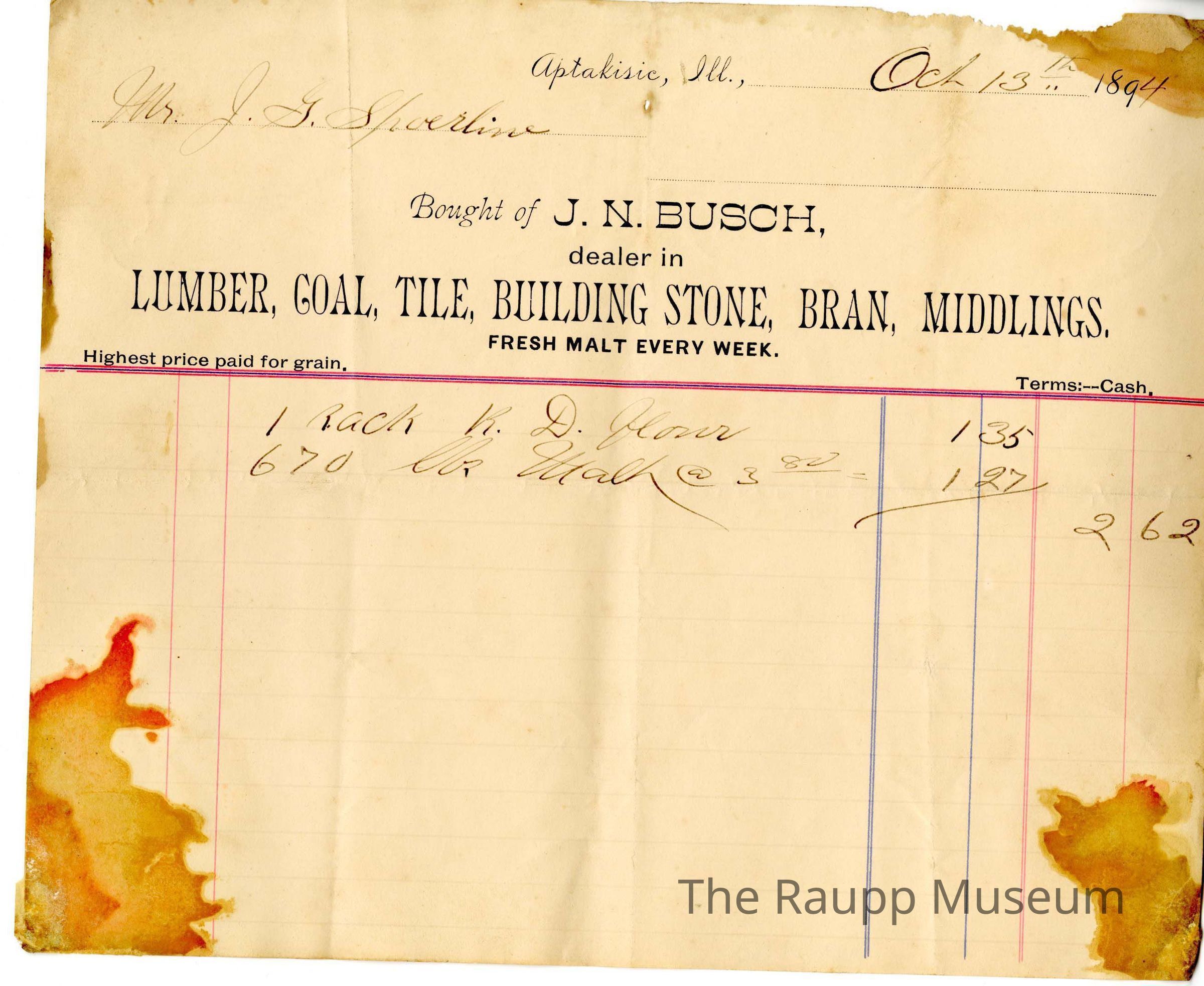 One (1) square receipt for J.G. Spoerline from J.N.Busch store. Printed along the top half is: "Aptakisic, ILL.,; Bought of J.N. Busch, Dealer in Lumber, Coal, Tile, Building Stone, Bran, Middlings; Fresh Malt Every Week; Highest price paid for grain, Terms: --Cash". Printed underneath the top label is red and blue lines for a space to write bought goods. Handwritten on the top is the date in the upper right corner: "Oct 13th 1894", and "Mr. J.G. Spoerlein." Handwritten in the receipt section is: "1 rack R.D. Flour 1.35, 670 lbs Malt @ 3.80 [total] 1.27. 2.62".Archive Details