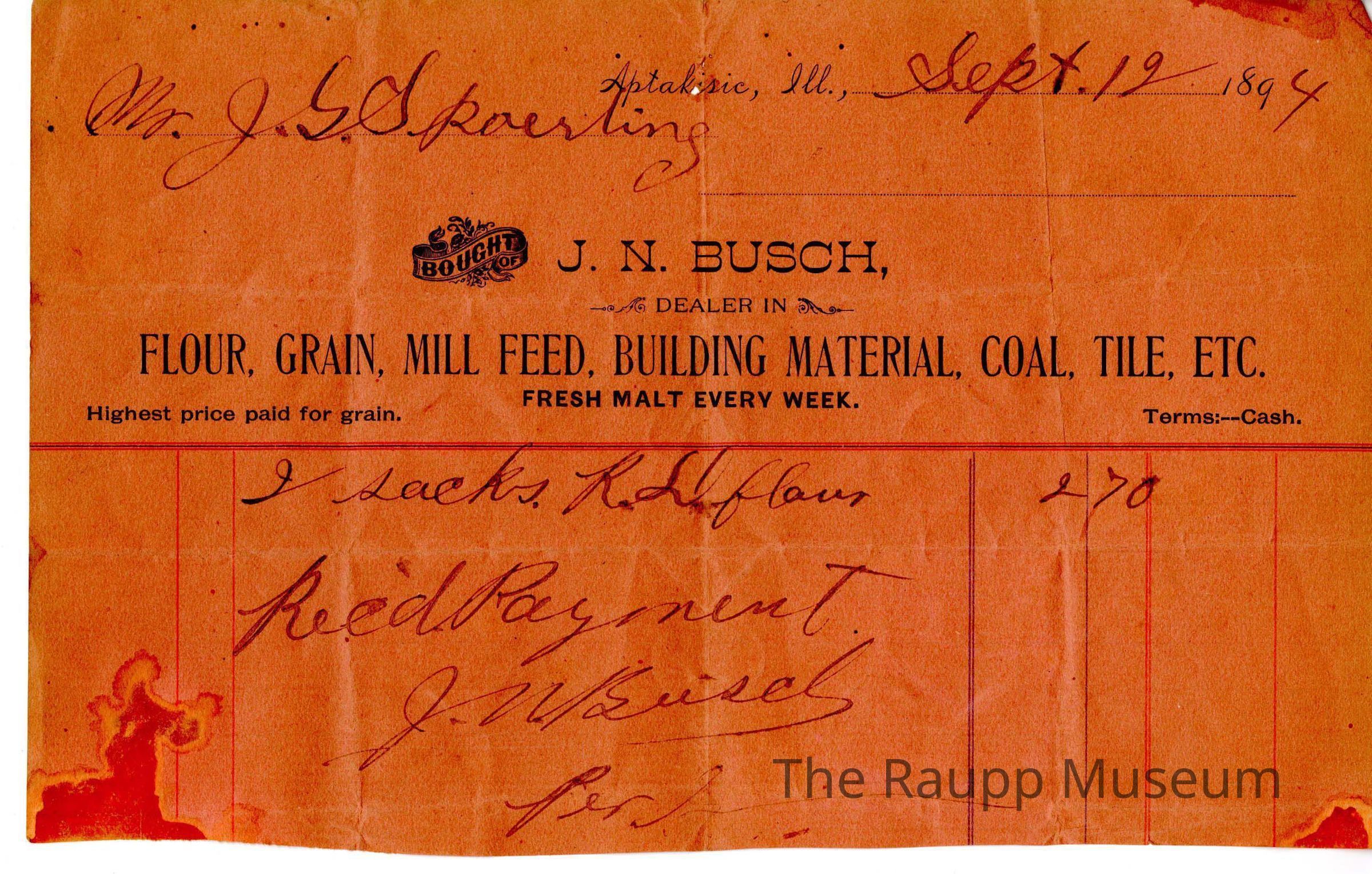 One (1) square yellow receipt for J.G. Spoerlein from J.N.Busch store. Printed along the top half is: "Aptakisic, ILL.,; Bought of J.N. Busch, Dealer in Flour, Grain, Mill Feed, Building Material, Coal, Tile, Etc; Fresh Malt Every Week; Highest price paid for grain, Terms: --Cash". Printed underneath the top label is red and blue lines for a space to write bought goods. Handwritten on the top is the date in the upper right corner: "Sept. 12 1894", and "Mr. J.G. Spoerling." Handwritten in the receipt section is: "2 sacks R.D. Flour 2.70, Rec'd Payment J.N. Busch, Per..."Archive Details