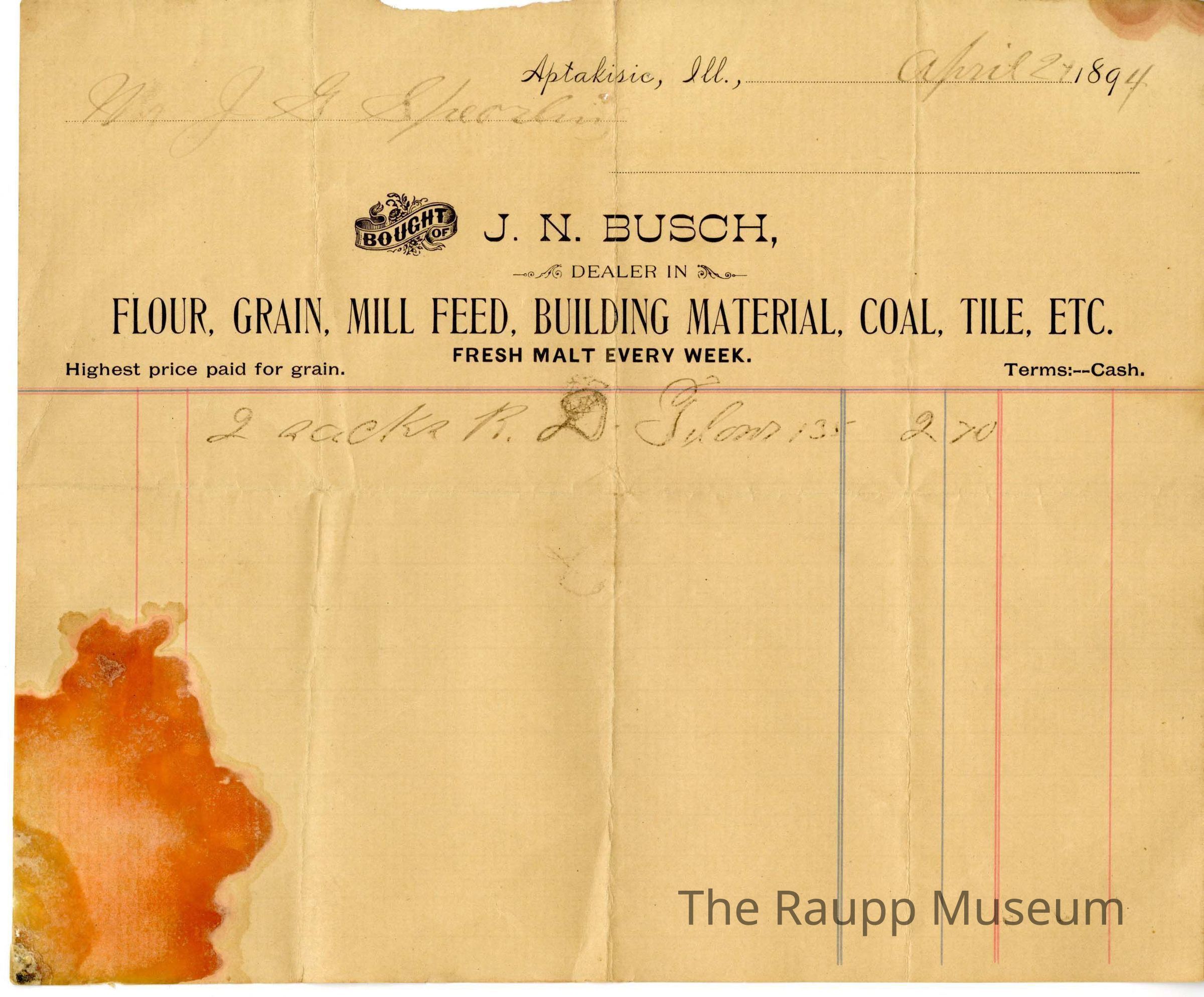 One (1) square receipt for J.G. Spoerlein from J.N.Busch store. Printed along the top half is: "Aptakisic, ILL.,; Bought of J.N. Busch, Dealer in Flour, Grain, Mill Feed, Building Material, Coal, Tile, Etc; Fresh Malt Every Week; Highest price paid for grain, Terms: --Cash". Printed underneath the top label is red and blue lines for a space to write bought goods. Handwritten on the top is the date in the upper right corner: "April 21 1894", and "Mr. J.G. Spoerling." Handwritten in the receipt section is: "2 sacks R.D. Flour 1.35, 2.70."Archive Details