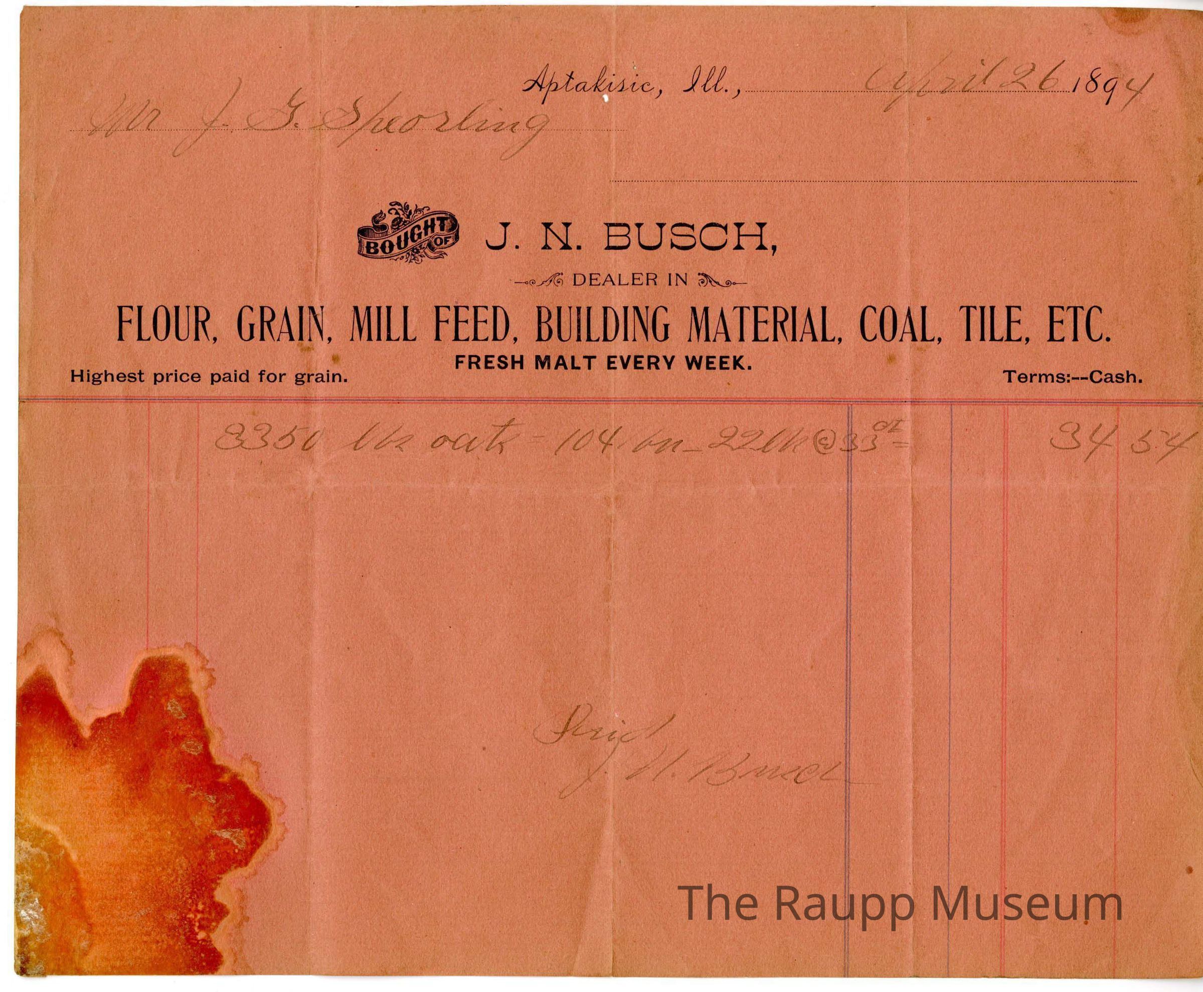One (1) square yellow receipt for J.G. Spoerlein from J.N.Busch store. Printed along the top half is: "Aptakisic, ILL.,; Bought of J.N. Busch, Dealer in Flour, Grain, Mill Feed, Building Material, Coal, Tile, Etc; Fresh Malt Every Week; Highest price paid for grain, Terms: --Cash". Printed underneath the top label is red and blue lines for a space to write bought goods. Handwritten on the top is the date in the upper right corner: "April 26 1894", and "Mr. J.G. Spoerling." Handwritten in the receipt section is: "3350 lbs oats - 104/ bn_ 22lk @ 33.0 = 34.54; Paid J.N. Busch." There are handwritten notes and numbers on the back.Archive Details
