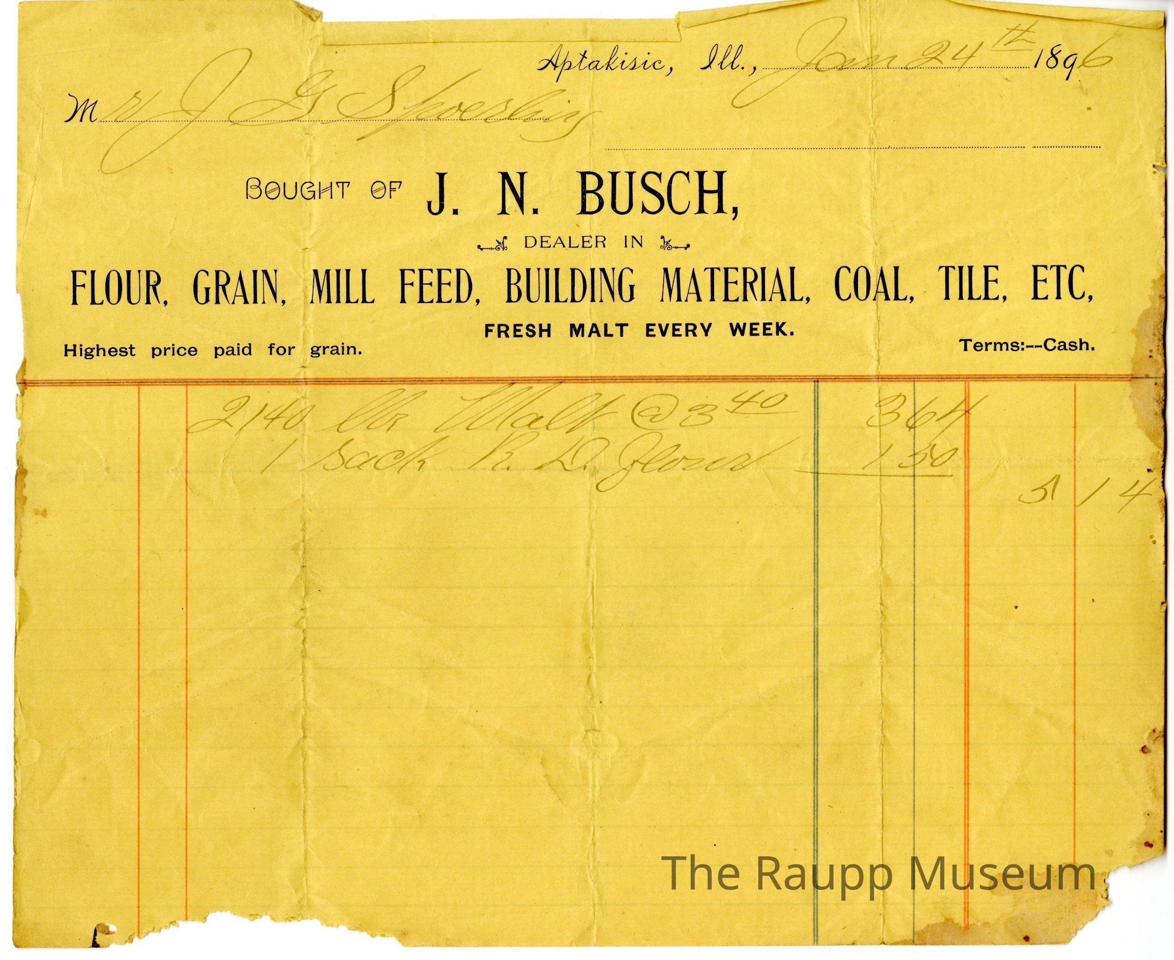 One (1) square yellow receipt for J.G. Spoerlein from J.N.Busch store. Printed along the top half is: "Aptakisic, ILL.,; Bought of J.N. Busch, Dealer in Flour, Grain, Mill Feed, Building Material, Coal, Tile, Etc; Fresh Malt Every Week; Highest price paid for grain, Terms: --Cash". Printed underneath the top label is red and blue lines for a space to write bought goods. Handwritten on the top is the date in the upper right corner: "Jan 24th 1896", and "Mr. J.G. Spoerlein." Handwritten in the receipt section is: "2140 Lbs. Malt @ 3.40, [total] 3.64., 1 sack R.D. flour 1.50; 5.14"Archive Details