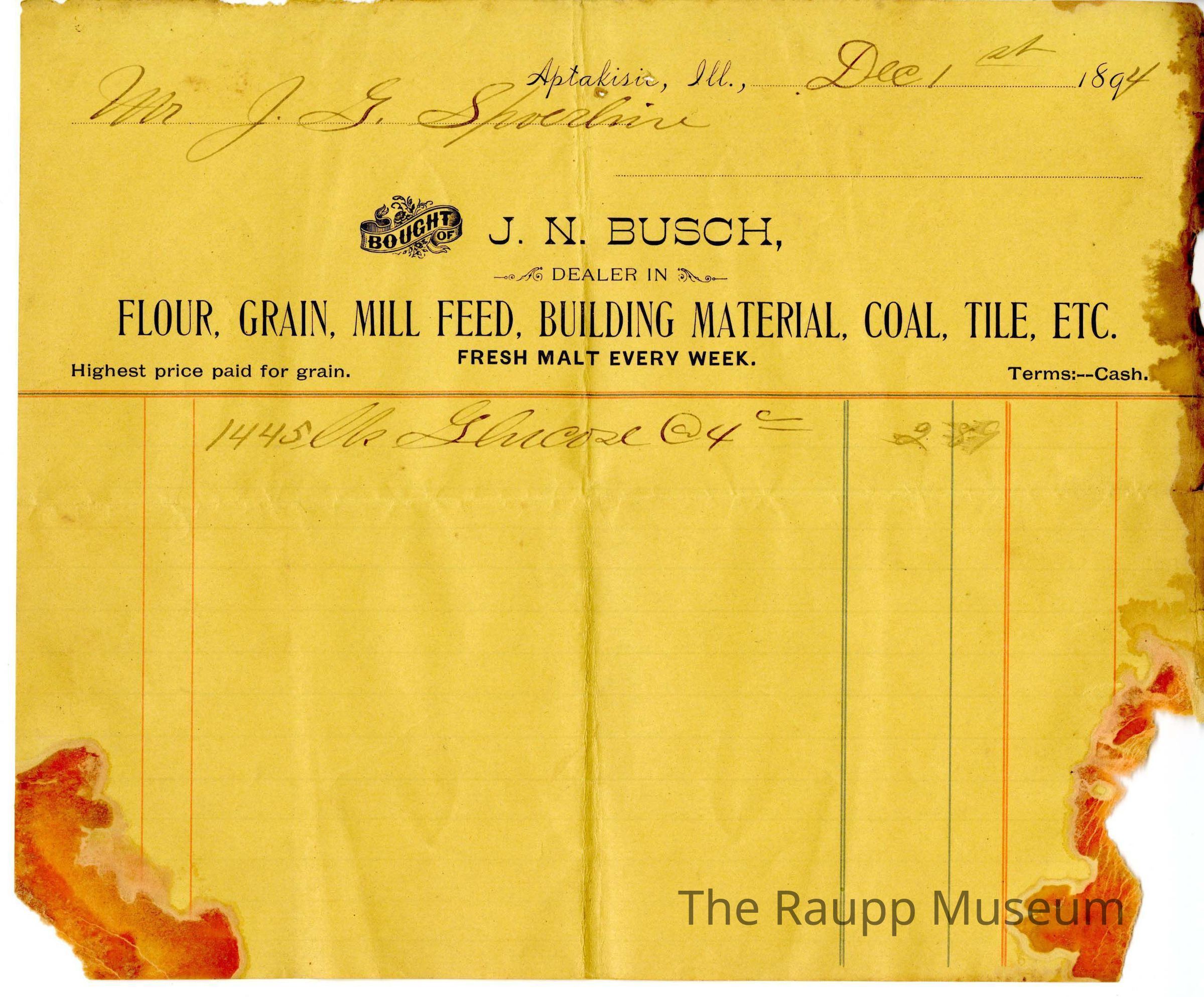 One (1) square yellow receipt for J.G. Spoerlein from J.N.Busch store. Printed along the top half is: "Aptakisic, ILL.,; Bought of J.N. Busch, Dealer in Flour, Grain, Mill Feed, Building Material, Coal, Tile, Etc; Fresh Malt Every Week; Highest price paid for grain, Terms: --Cash". Printed underneath the top label is red and blue lines for a space to write bought goods. Handwritten on the top is the date in the upper right corner: "Dec 1st 1894", and "Mr. J.G. Spoerlein." Handwritten in the receipt section is: "1445 Lbs. Glucose @ 4.00, [total] 2.89."Archive Details