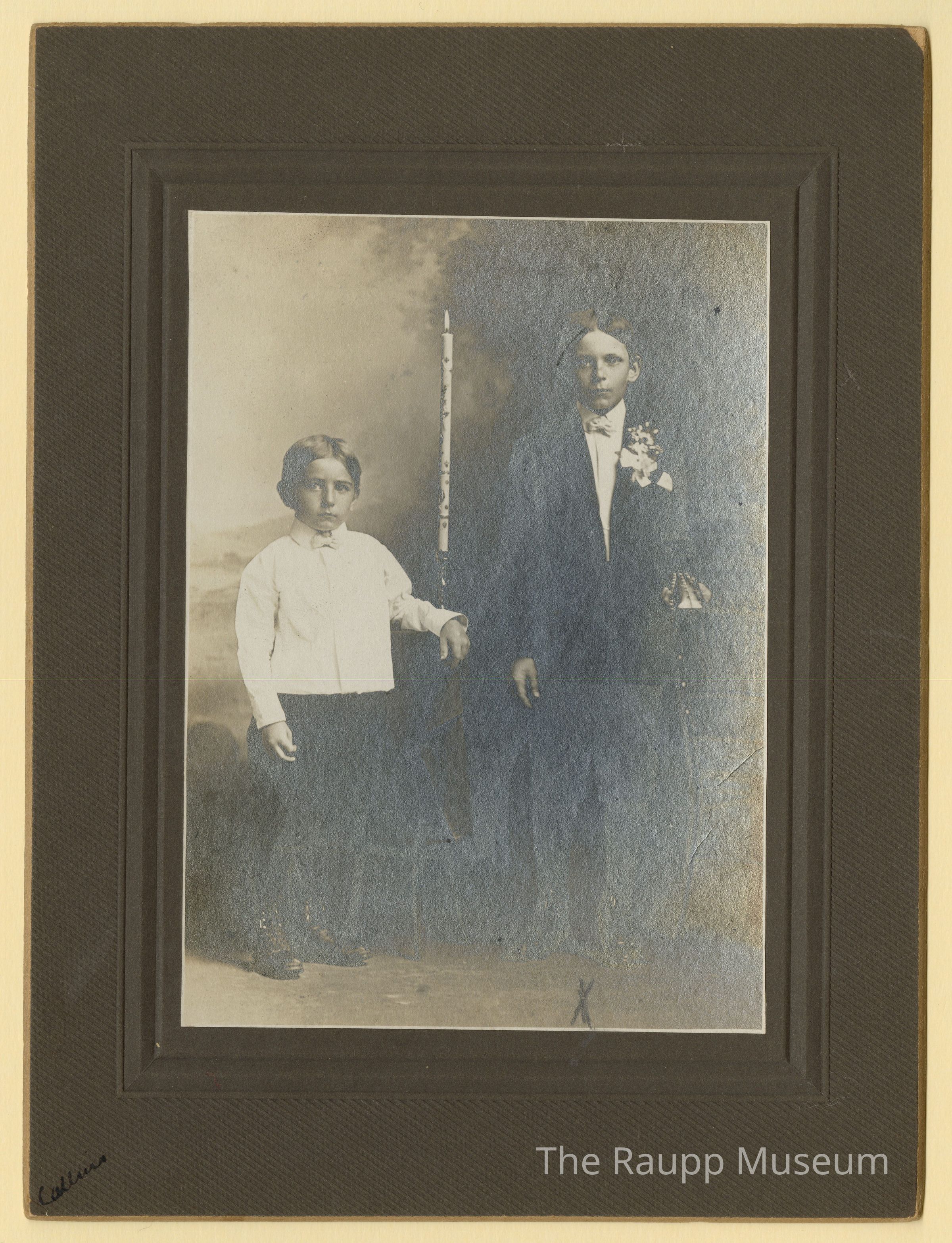 One (1) black and white photograph of two children in dress outfits. The younger bot on the left is in a white shirt and black pants, and the boy on the right is in a black suit with white undershirt and white flower. There is a first communion candle behind them on a table. On the back is handwritten "Mrs. J. G. Weidner Jr. Son-Leo, Rt. Prairie View ILL, 4 Vernon..."