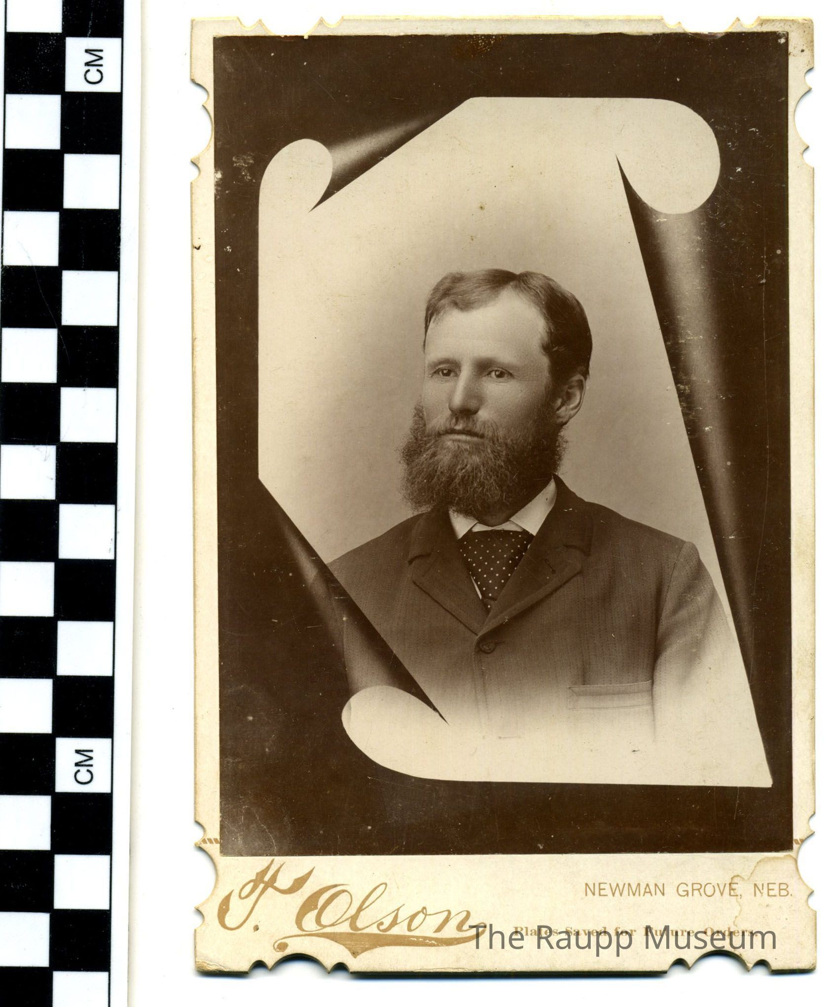 Black and white photographic print with brown tones mounted to a white card with decorative edges. Portrait image of Jacob Weidner. He has a large, full dark beard and is wearing a wide polka-dot necktie and suit. Image superimposed to look as if printed on a scroll. Photographer information printed on lower front edge under the image. reverse side pencil text: "Uncle Jacob Weidner."Dimensions