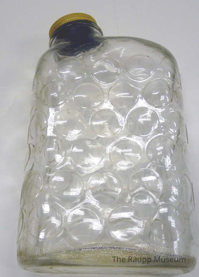 Glass honey jar with bubble glass design. Metal lid with yellow and silver hive logo reads: "Pure Honey."