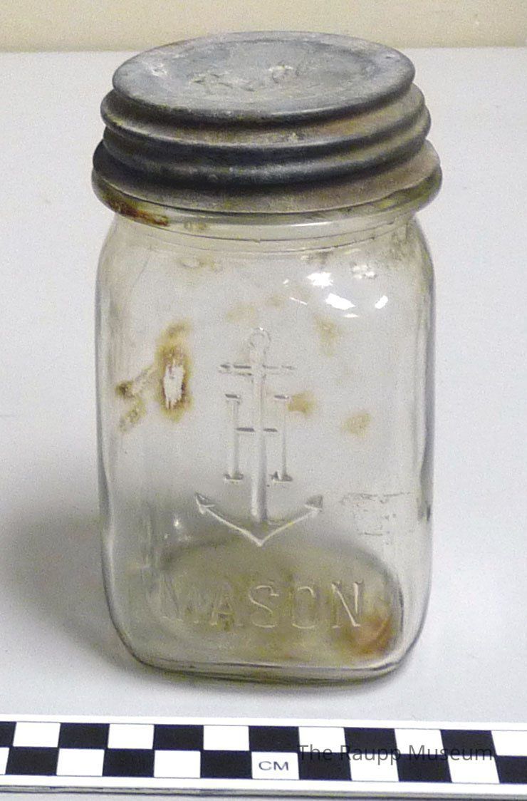 Square-shaped clear glass canning jar with rounded upper edges, threaded lip and metal "Ball" lid. Embossed anchor logo and "Mason" embossed on one side. Base has embossed "3; 13; 43"Dimensions