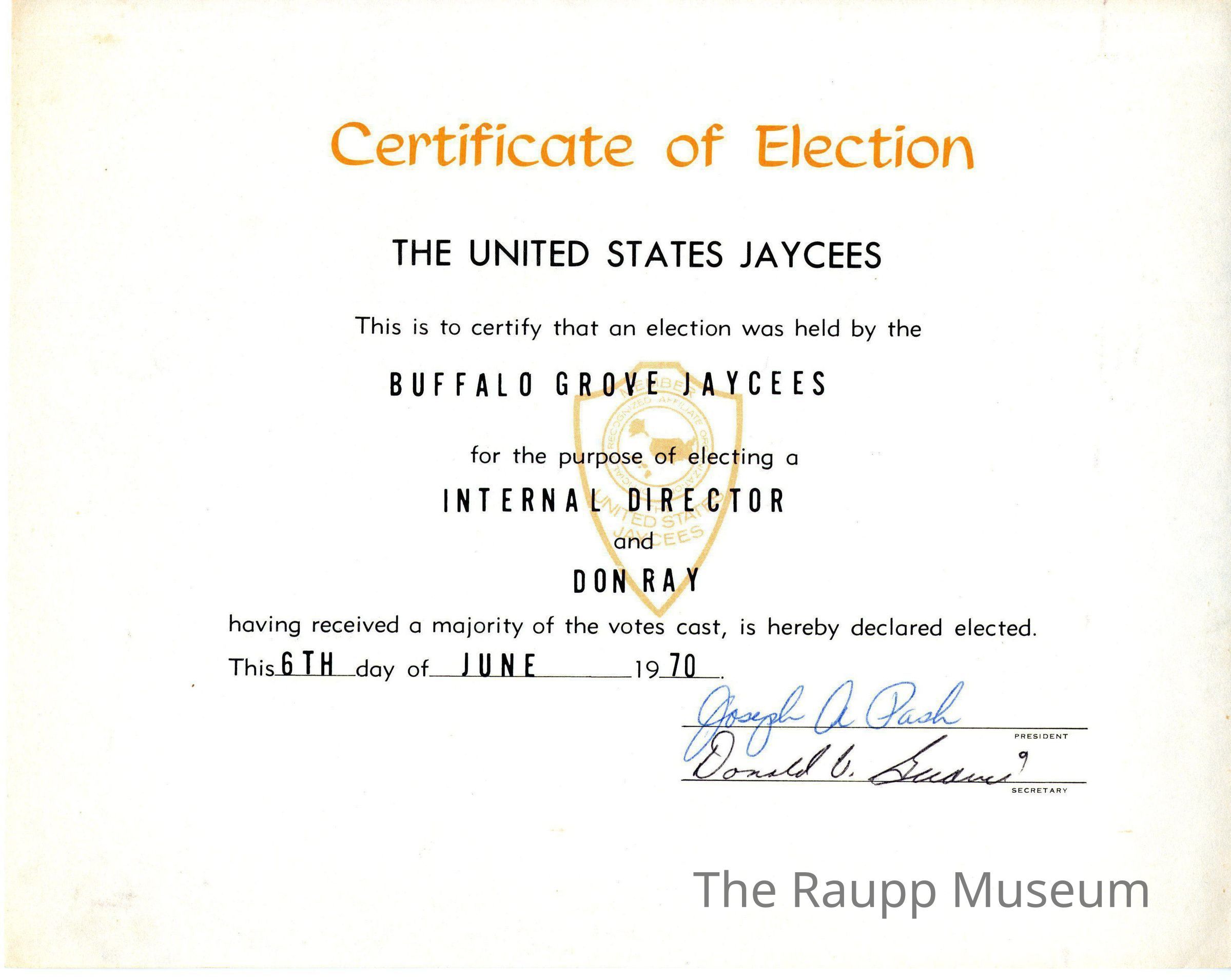 One (1) white, black, and orange Certificate of Election for Don Ray elected as Internal Director for the Buffalo Grove Jaycees. Certificate is white with black lettering and an orange title "Certificate of Election". The Jaycees insignia is printed in orange behind the text in center. Certificate is dated June 6, 1970 and signed by President and Secretary.Archive Details