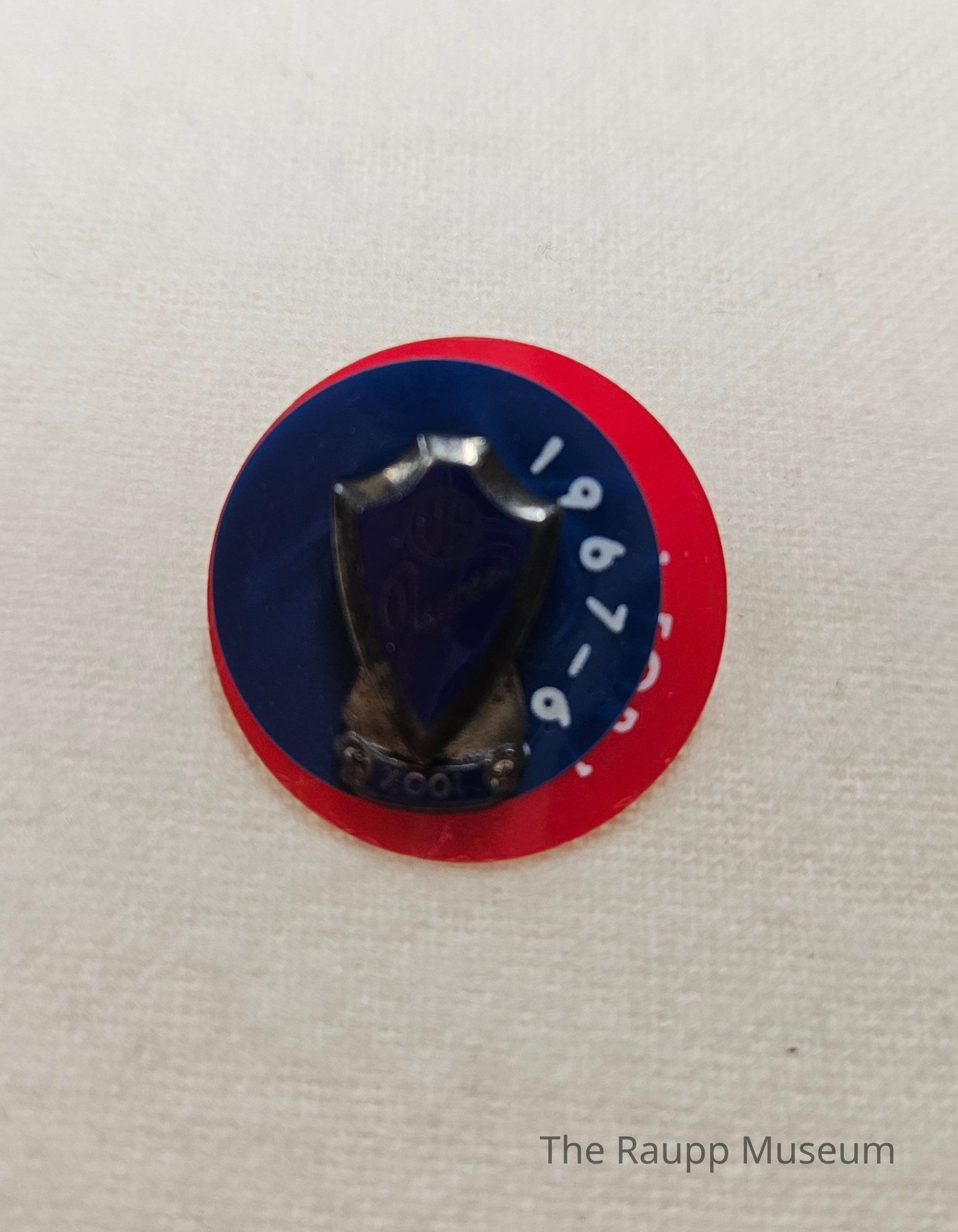 One (1) metal and plastic circular Jaycees Pin. Pin has two circles - red and blue - with a silver and blue emblem pin on top. The blue circle has "1967-1968" printed on it in white, and the red has "1 FOR 1". The emblem has "US Jaycees" in center, with a piece on top that has "100%". Affixed at the back is a round metal stopper.Made/Created