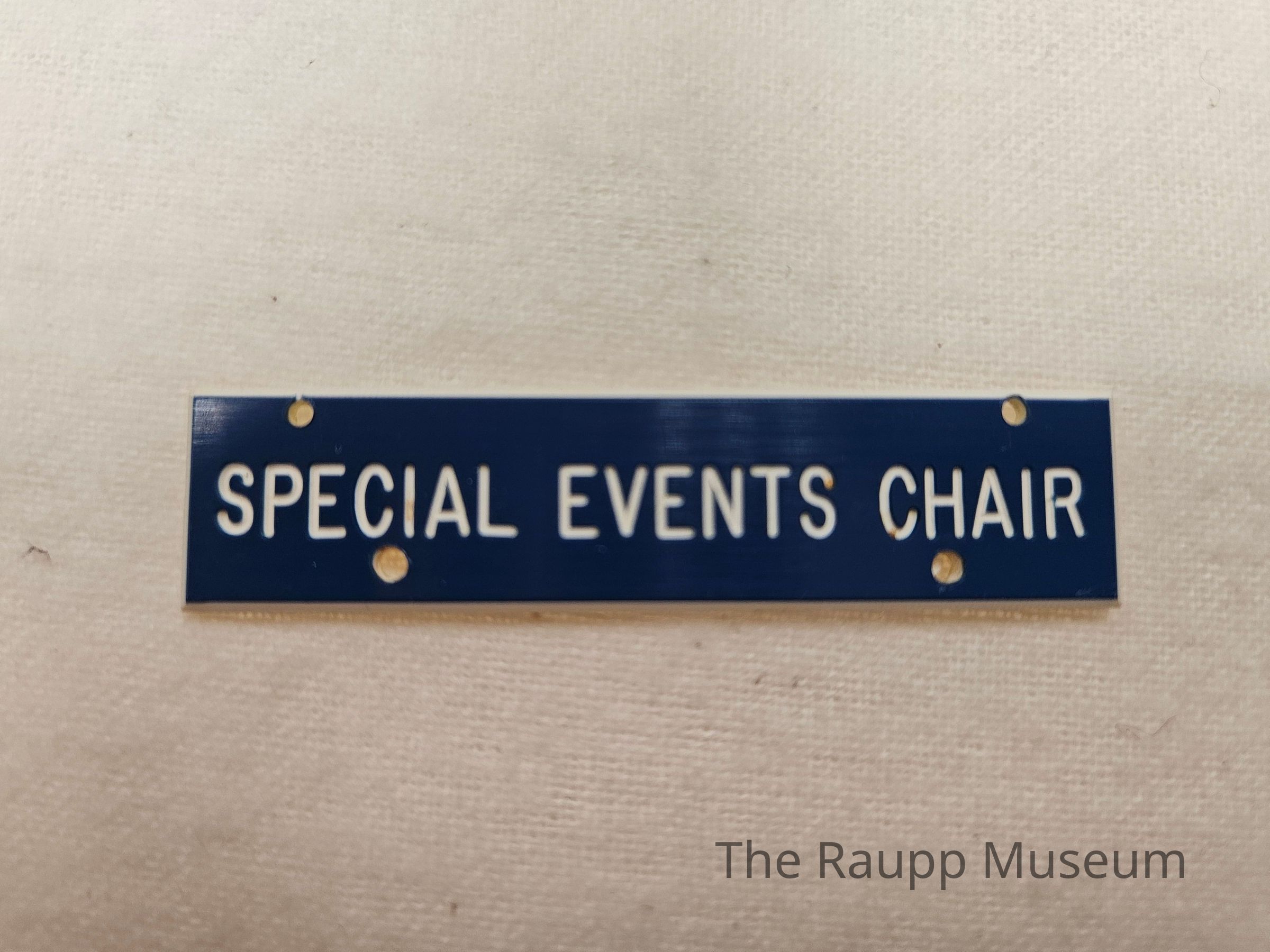 One (1) plastic rectangular blue and white Jaycees pin. The front is blue with white lettering: "SPECIAL EVENTS CHAIR". The back is white. There are four holes, two top and two bottom, on edge of pin. On the back in marker is handwritten "JC".Relationships