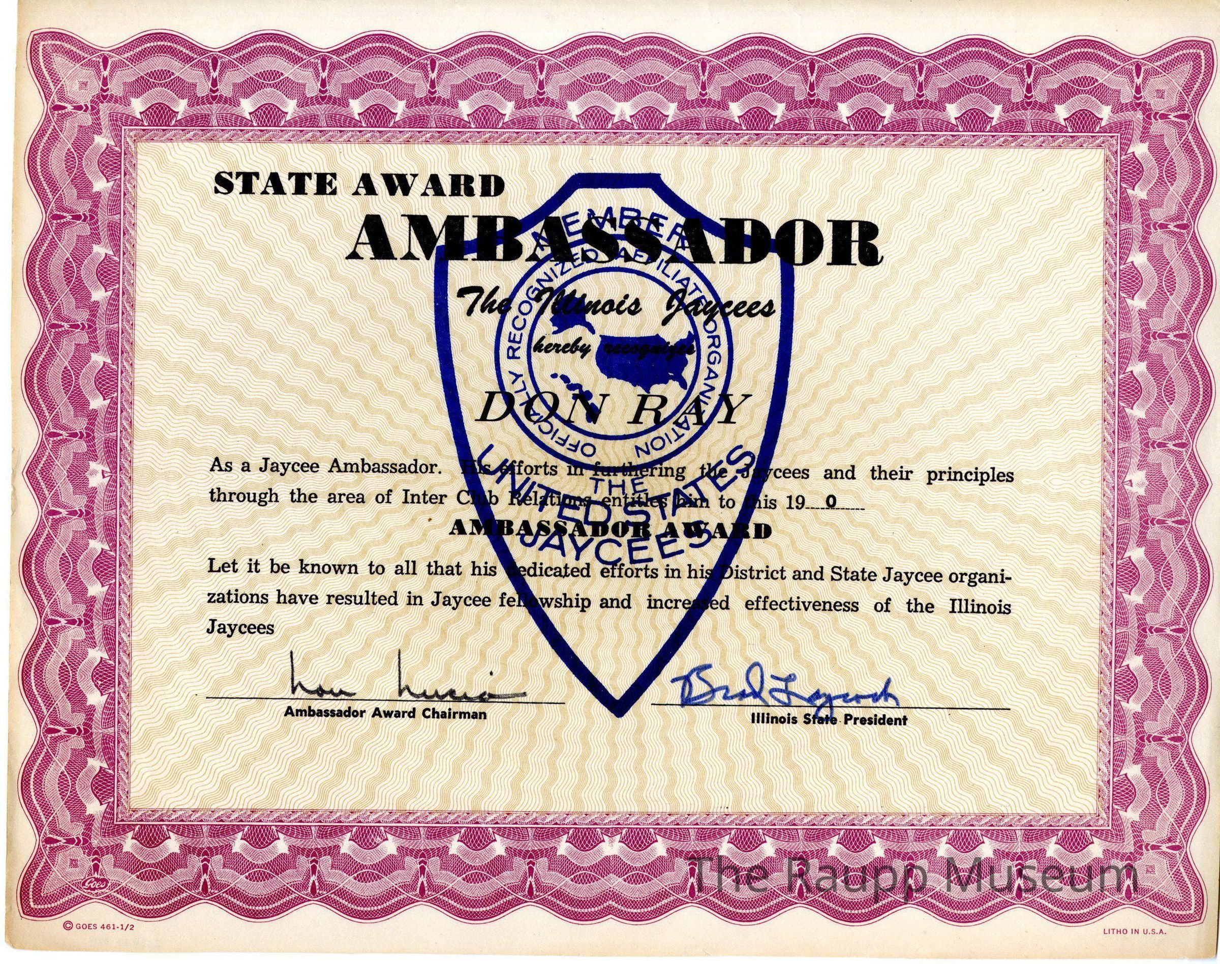 One (1) purple, white, and black State Award Ambassador certificate for Don Ray in 1969. Award has a decorative purple border, with gold wave lines going from the center outward. There is a blue Jaycees insignia printed behind the text in the center. Award is signed by Ambassador Award Chair and Illinois State President. Date box in center of text only has a "0" - most likely 1970 based on other certificates.Archive Details