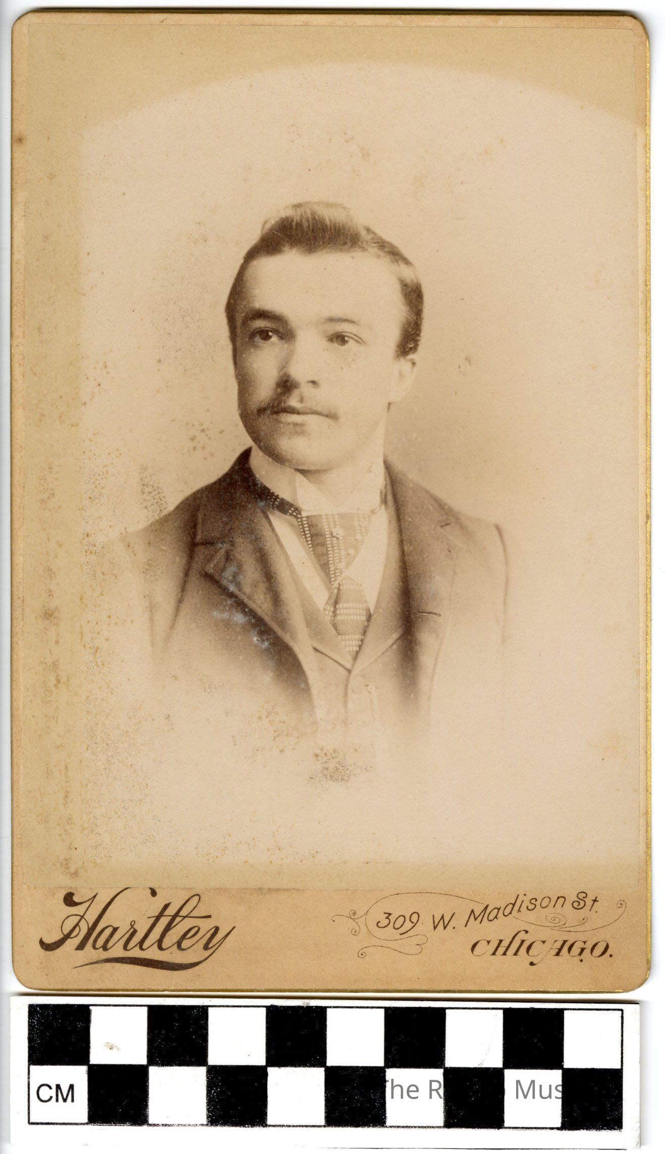 The photo is attached to a beige mat board. On the bottom is printed "Hartley, 309 W. Madison St., Chicago". On the back is printed "Hartley Portraits, 309 Madison St., Chicago, The original of this photograph is preserved. Duplicates may be had at any time. Cloudy Days as good as sunshine, studio open every day".