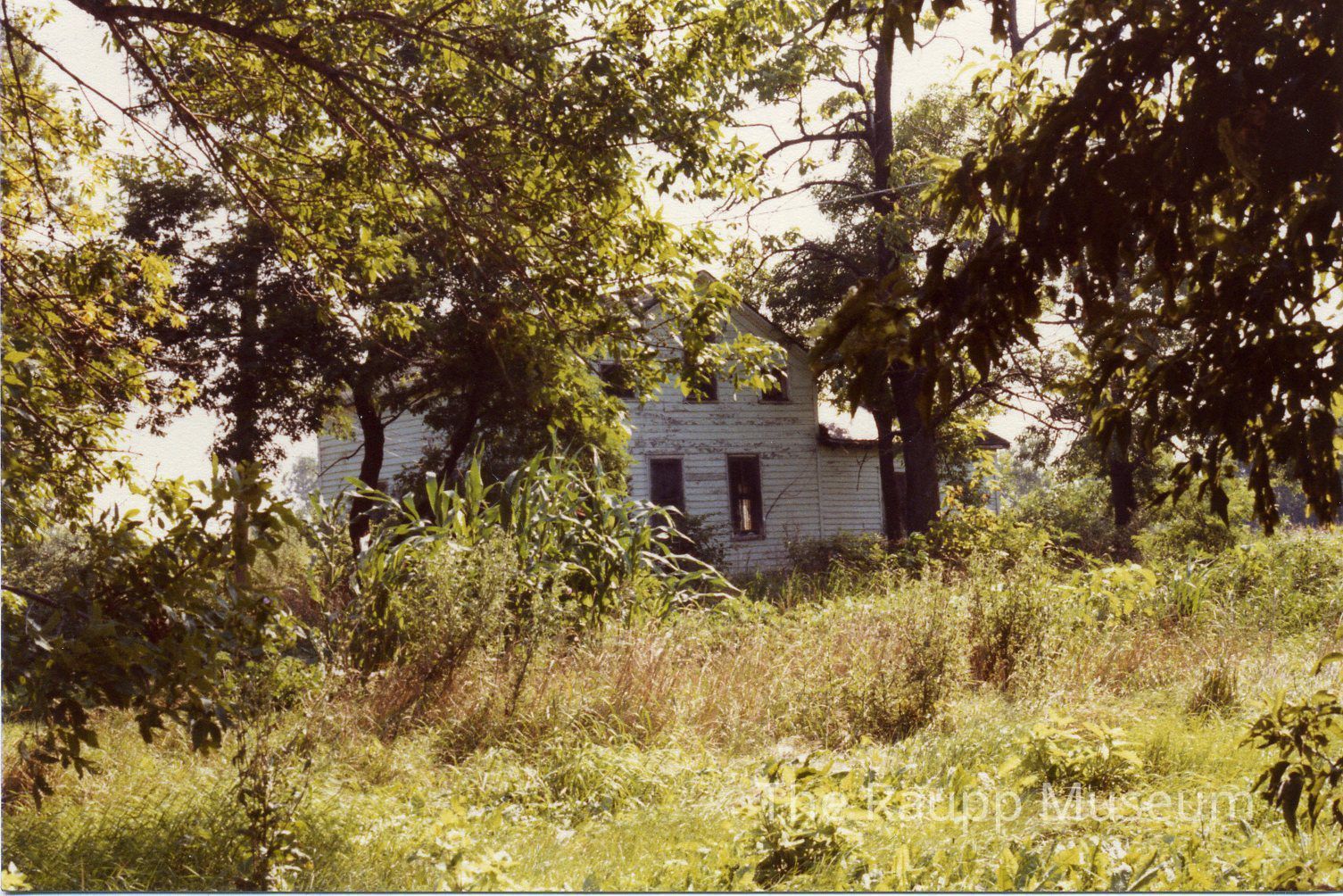 Color photographic print. Image of a white wooden house exterior, mostly obscured by trees and overgrown grasses. Accompanying archivist note suggests image is the John Bornhofen house on Busch Road. House looks run down. Reverse side stamp: "Print made by Kodak Aug 81." Image printed on Kodak paperMade/Created