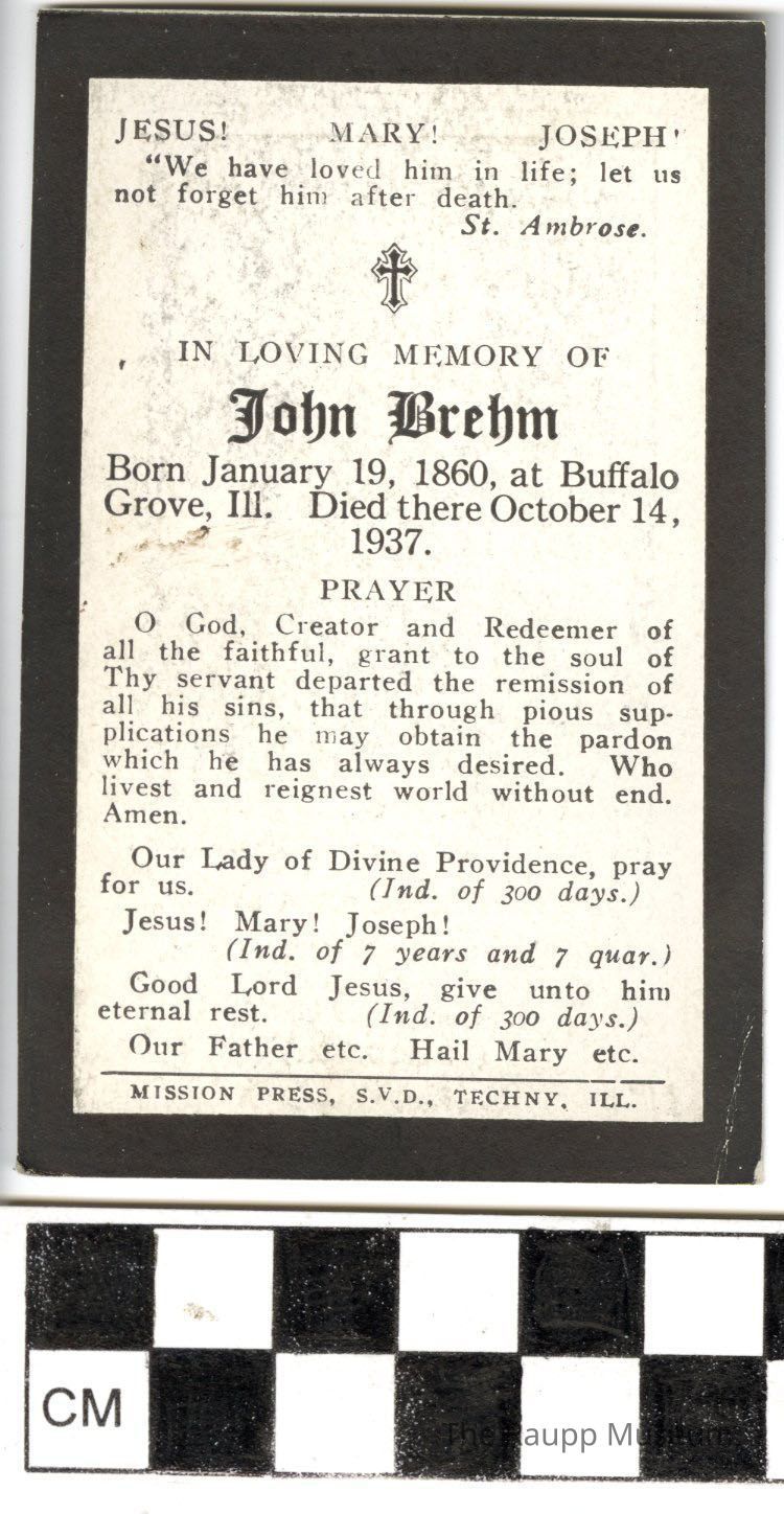One (1) funeral prayer card for John Brehm, born 01/19/1860, and died 10/14/1937. On one side is an obituary, scripture, and prayer in English. On the other side is a black and white picture of the Virgin Mary praying with white and black cloaks on, and a prayer underneath.