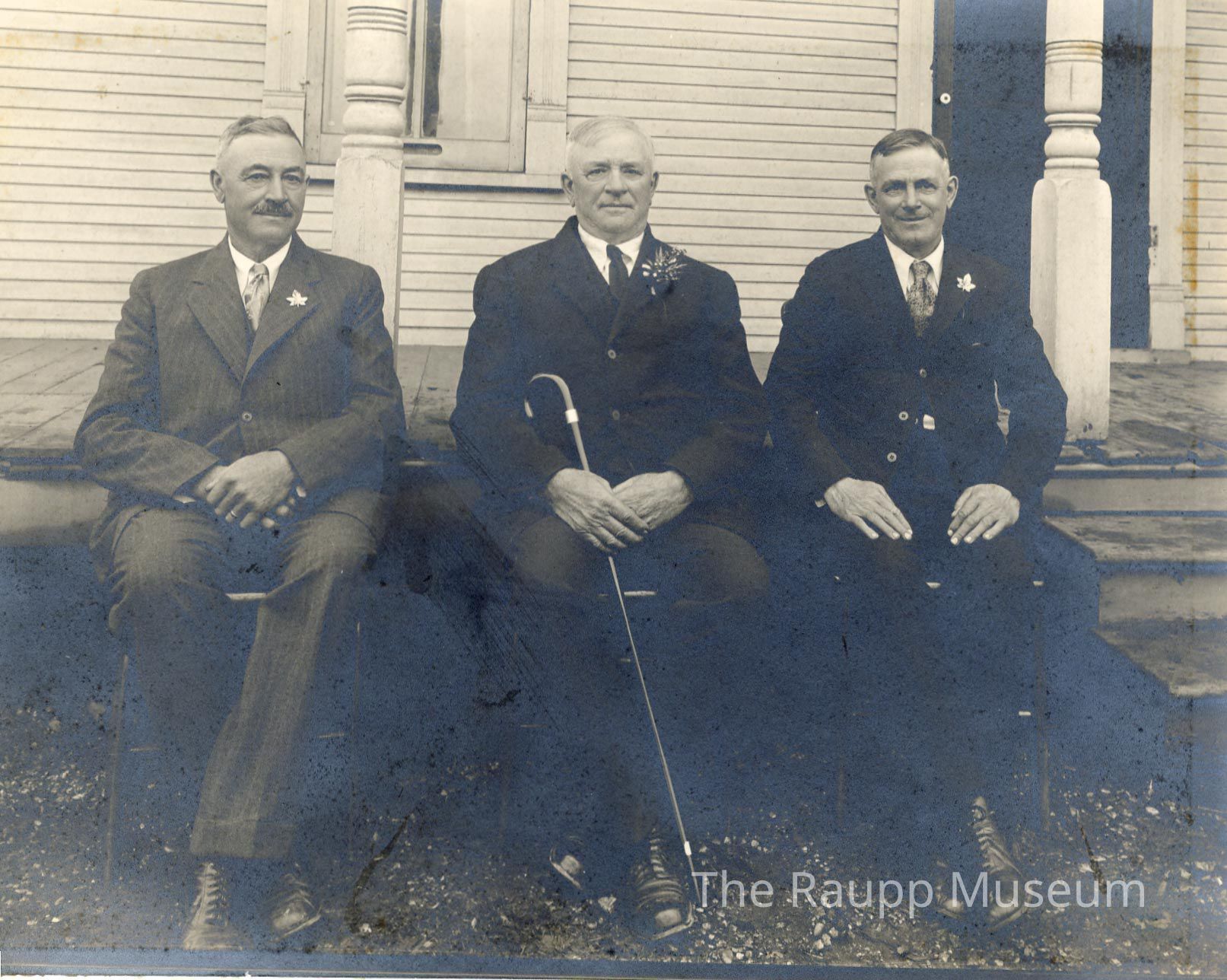 One (1) black and white photograph of Michael, John, and Carl Raupp (sons of Melchior Raupp and Maria Theobald). They gathered for John's 50th wedding anniversary 1931, on porch of John Raupp home. The three men are seated outside John Raupps home. They all have dark suits with ties on.Made/Created