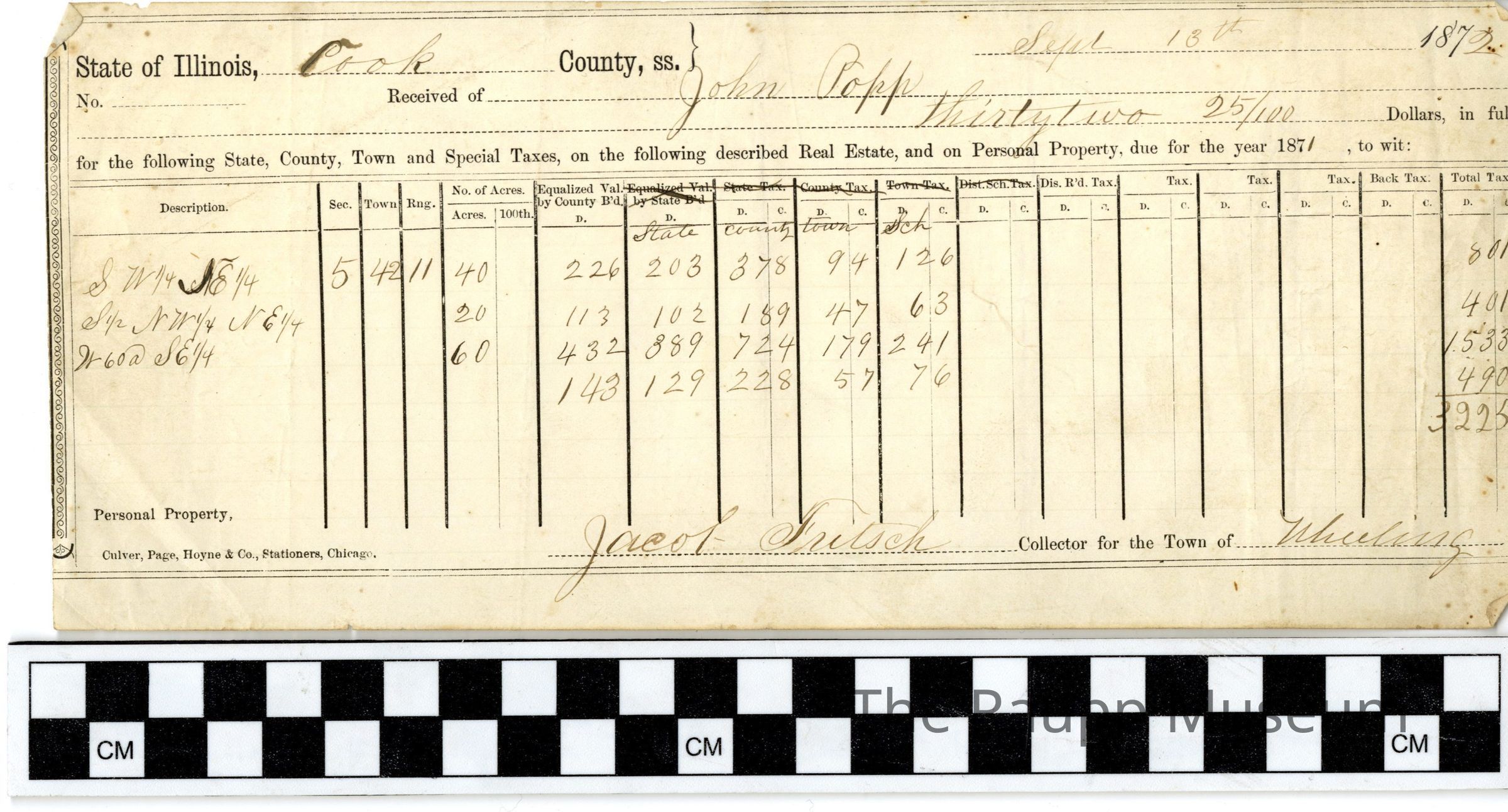 One (1) receipt for John Popp's 1871 taxes from the State of Illinois, prepared on 09/13/1872. The rectangular paper has printed text mixed with handwritten text in black ink. The total paid in taxes is $32.25 and includes three property spots: $8.01 $4.01, and $15.33, and personal property at $4.90. It is signed by Jacob Fritsch, the collector of Wheeling.Archive Details
