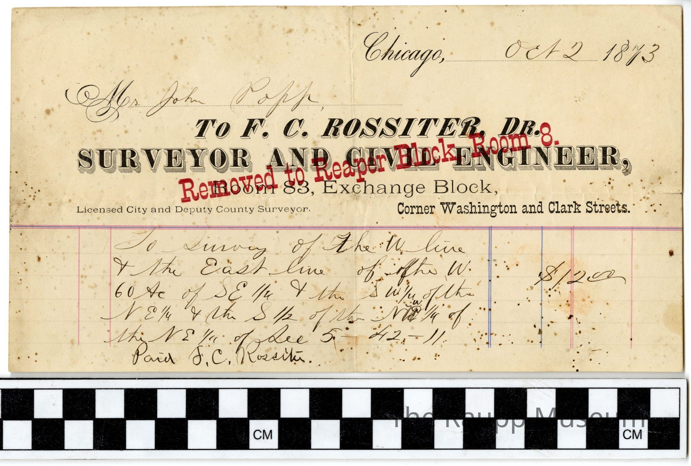 One (1) receipt for a land survey of John Popp's land, done by F.F. Rossiter, Dr., Surveyor and Civil Engineer in Chicago. The survey cost $12.00 and receipt dated Oct. 2, 1873. There is a mixture of printed text in black and red, and handwritten text in black ink.Archive Details