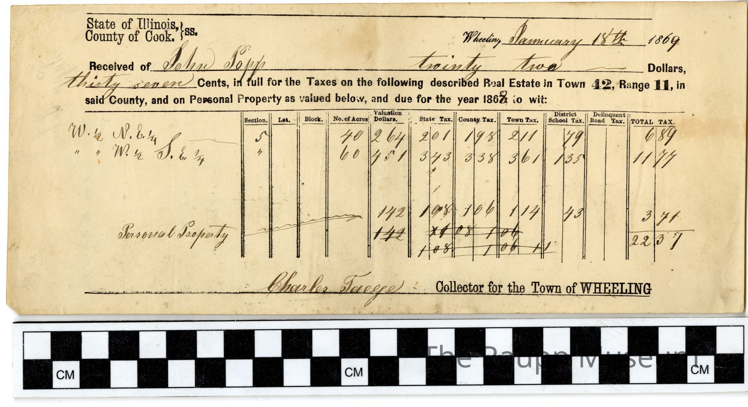 One (1) receipt for property taxes for the year of 1868, completed on 01/18/1869. The receipt includes taxes for two plots of land, and personal property, at $6.89, $11.77, and $3.71, for a total of $22.37. The taxes are signed by Charles Teuge, the collector for Wheeling. The receipt includes printed text, and handwritten text in black ink. On the back handwritten in ink is "Popp John" and " Eva Weidner 346".Archive Details