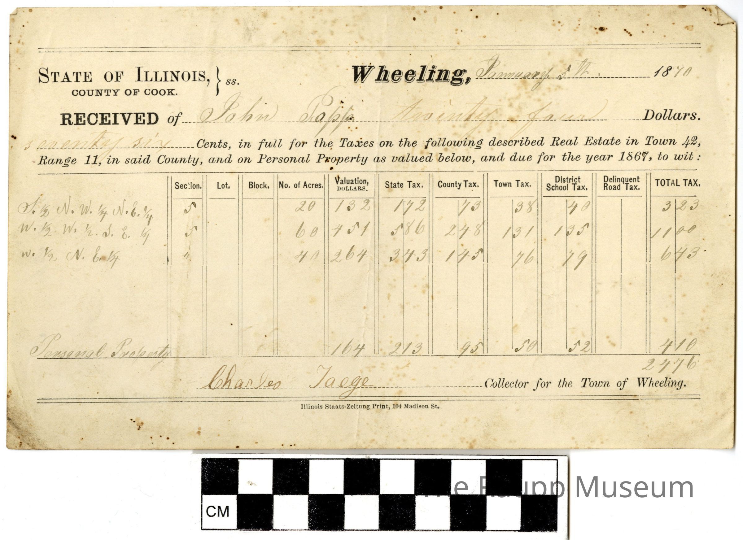 One (1) receipt for property taxes for the year of 1869, for John Popp. These Illinois State taxes were collected by the town collector of Wheeling. The total taxes were $24.76 for three total land plots ($3.23, $11.00 and $6.43), and personal property at $4.10. There is a mixture of printed text, and handwritten text in black ink. It is signed by Charles Taeje. "Popp John" is handwritten on the back.Archive Details