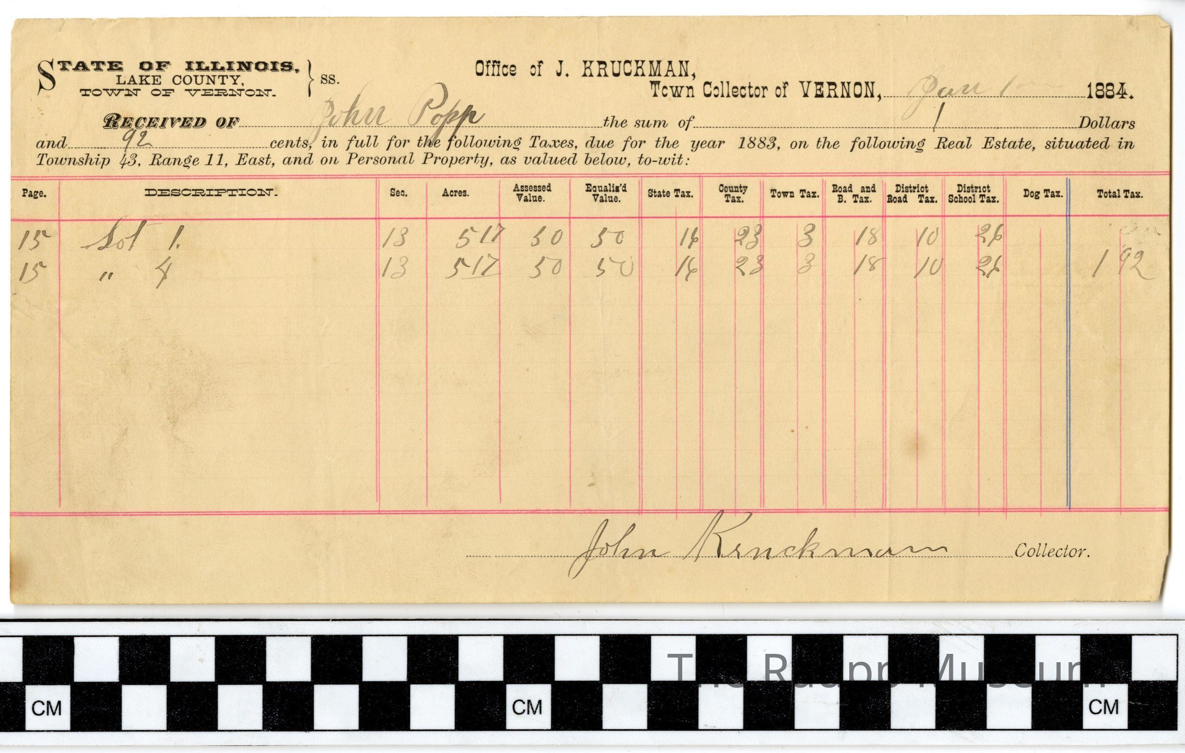 One (1) receipt for property taxes for the year of 1883, for John Popp. These Illinois State taxes were collected at the Office of J. Kruckman, town collector of Vernon. The total taxes was $1.92 for two total land plots, and include the state, county, town, road, and school tax. There is a mixture of printed text, and handwritten text in black ink. It is signed by John Kruckman.Archive Details