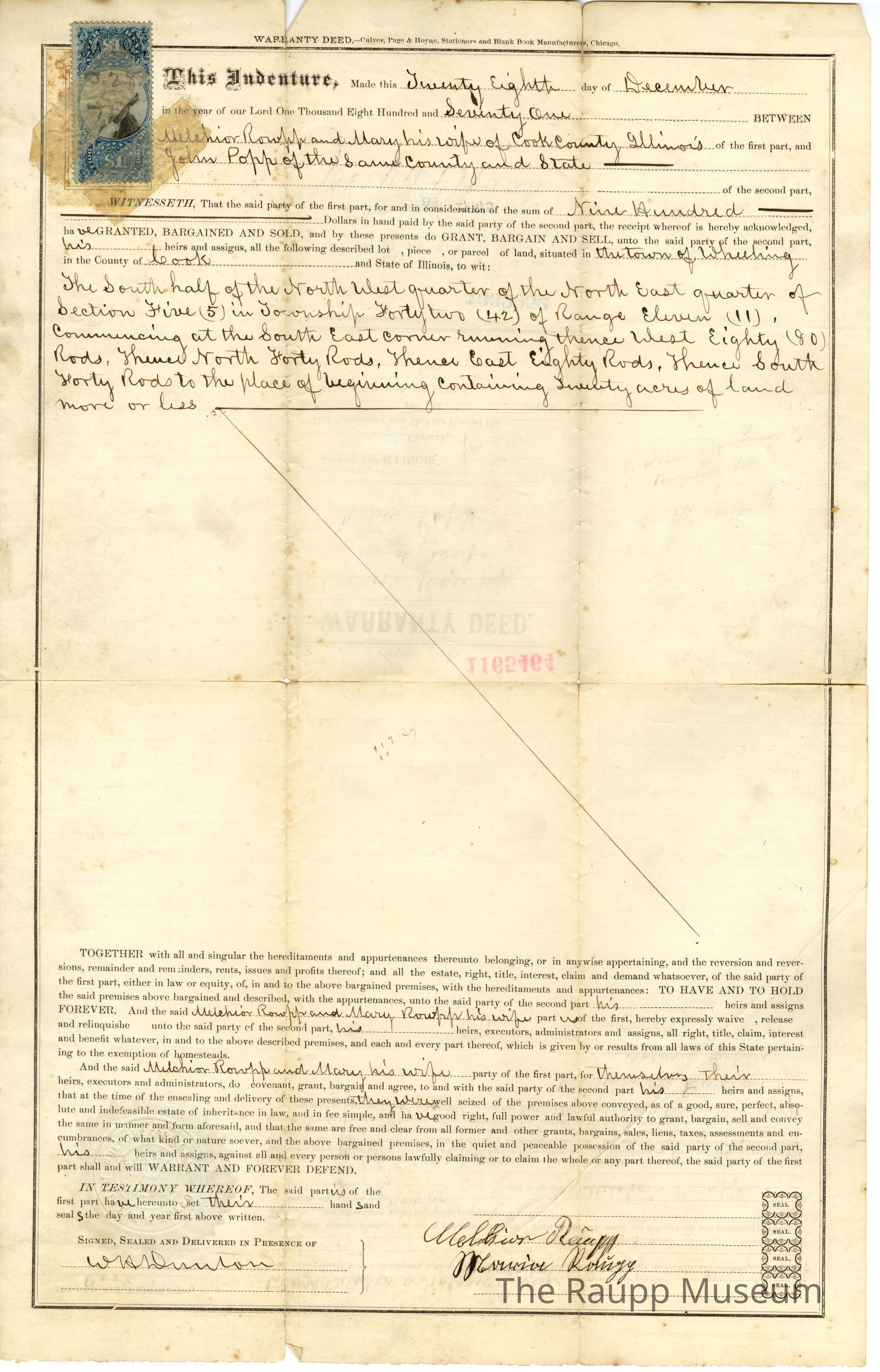 One (1) warranty deed transferring land from Melchior and Mary Raupp to John Popp. The land was situated in the town of Wheeling. The deed documents the location of the land. The land was sold for 900 dollars. There is a $1 blue stamp in the top left corner on the inside and a red star shaped cook county seal on the opposite, outer side. William Dunton was the notary public that signed the document. The deed is numbered 1165464 in red on the cover, and also stamped in blue 7332952 in 1921 filling.Archive Details