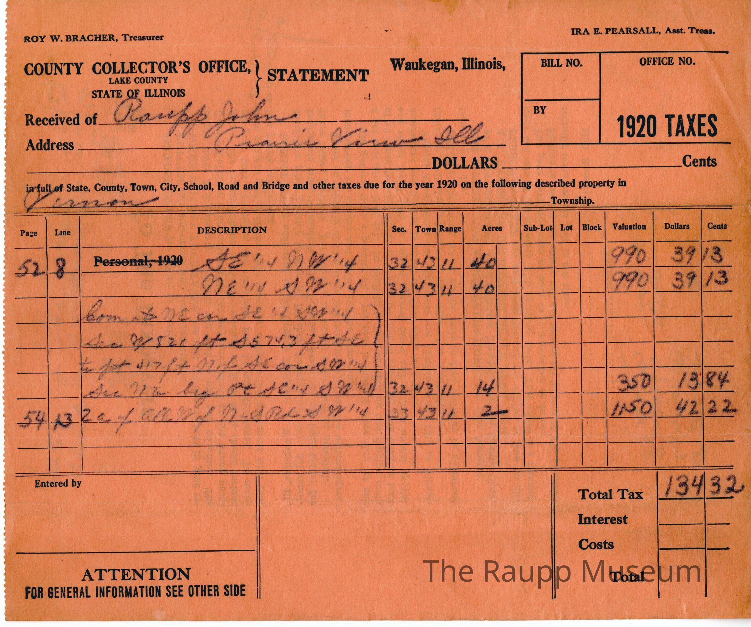 One (1) tax receipt for the year 1920 for John Raupp. Receipt is pink, has handwritten text stamped from being pressed on. Total tax was $134.32. Instructions printed on the back with handwritten addition.Archive Details