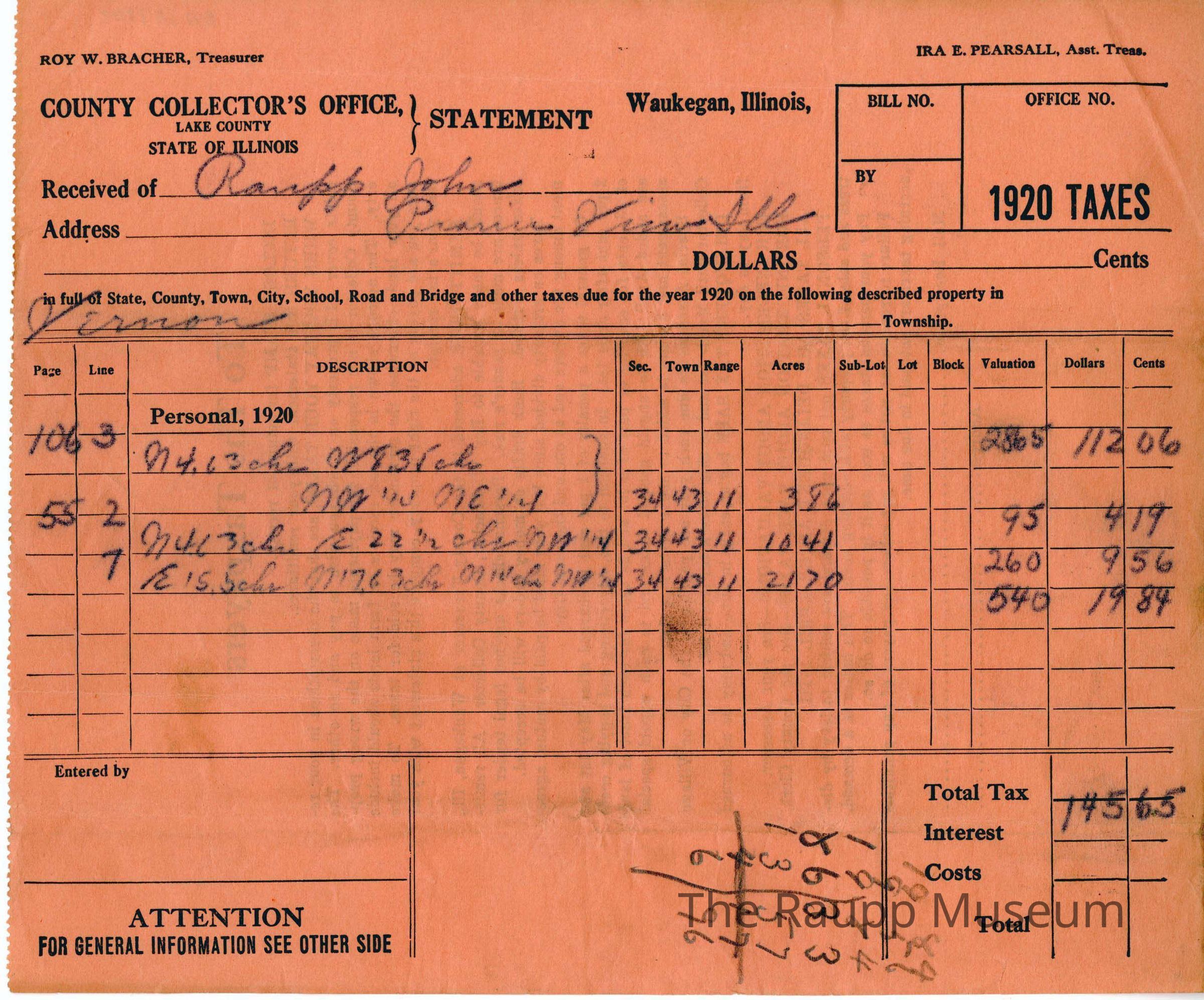 One (1) tax receipt for the year 1920 for John Raupp. Receipt is pink, has handwritten text stamped from being pressed on. Total tax was $145.65. Instructions printed on the back.Archive Details