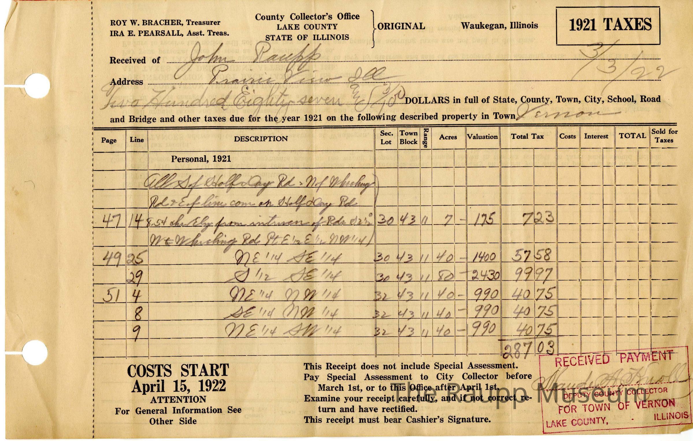 One (1) tax receipt for 1921 for John Raupp. Receipt is white, with pencil handwritten tax infromation. Total tax was $287.03. Stamped and signed by Vernon Deputy County Collector. Instructions printed on back.Archive Details