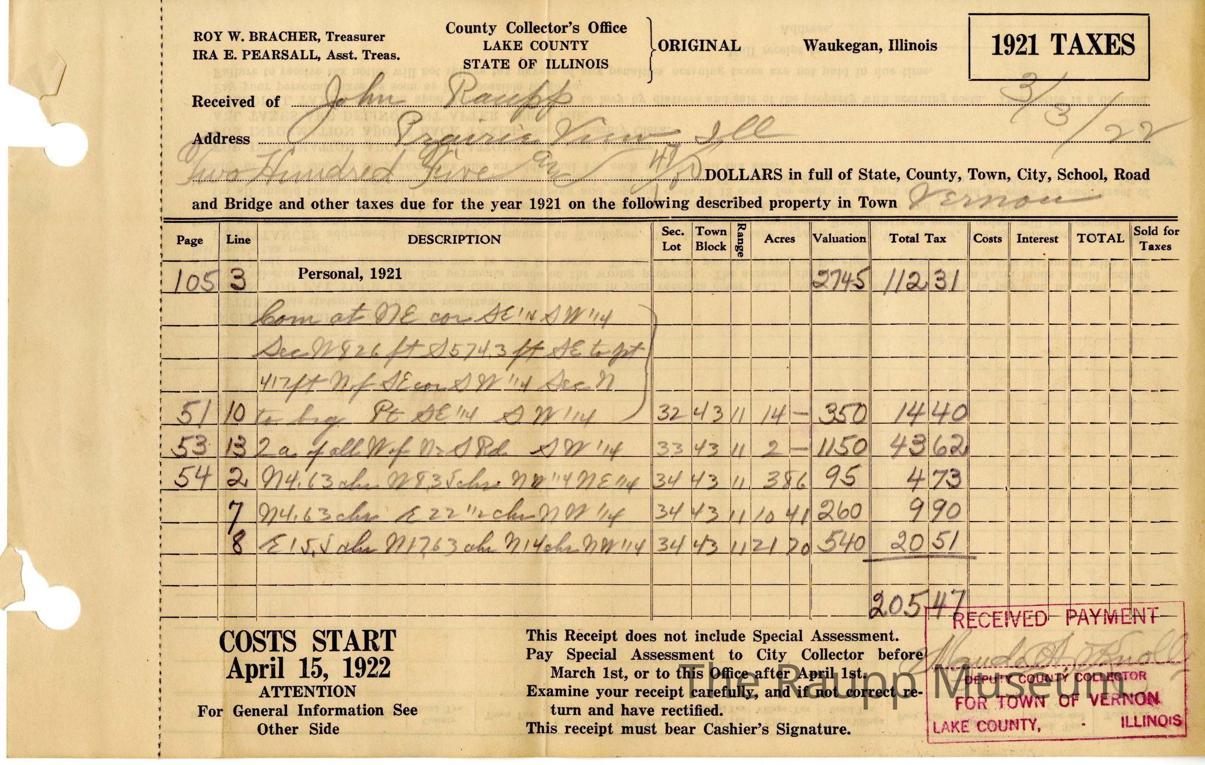 One (1) tax receipt for 1921 for John Raupp. Receipt is white, with pencil handwritten tax information. Total tax was $205.47. Stamped and signed by Vernon Deputy County Collector. Instructions printed on back.Archive Details