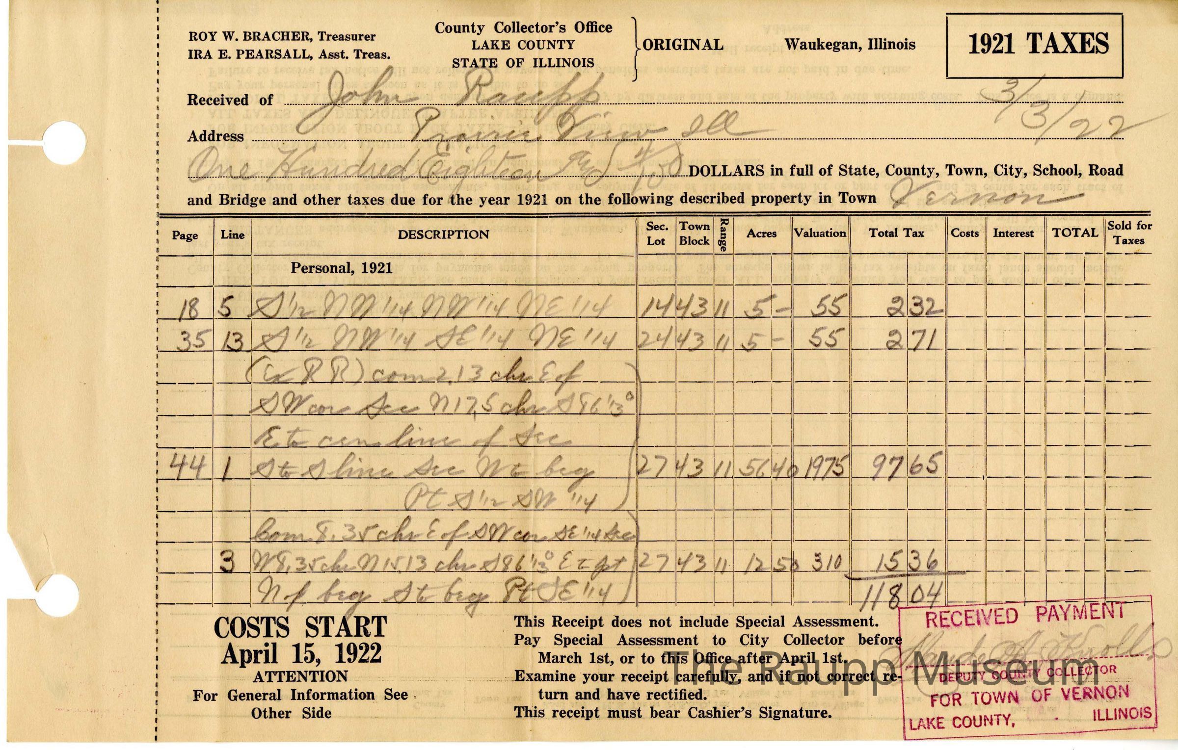 One (1) tax receipt for 1921 for John Raupp. Receipt is white, with pencil handwritten tax information. Total tax was $118.04. Stamped and signed by Vernon Deputy County Collector. Instructions printed on back.Archive Details