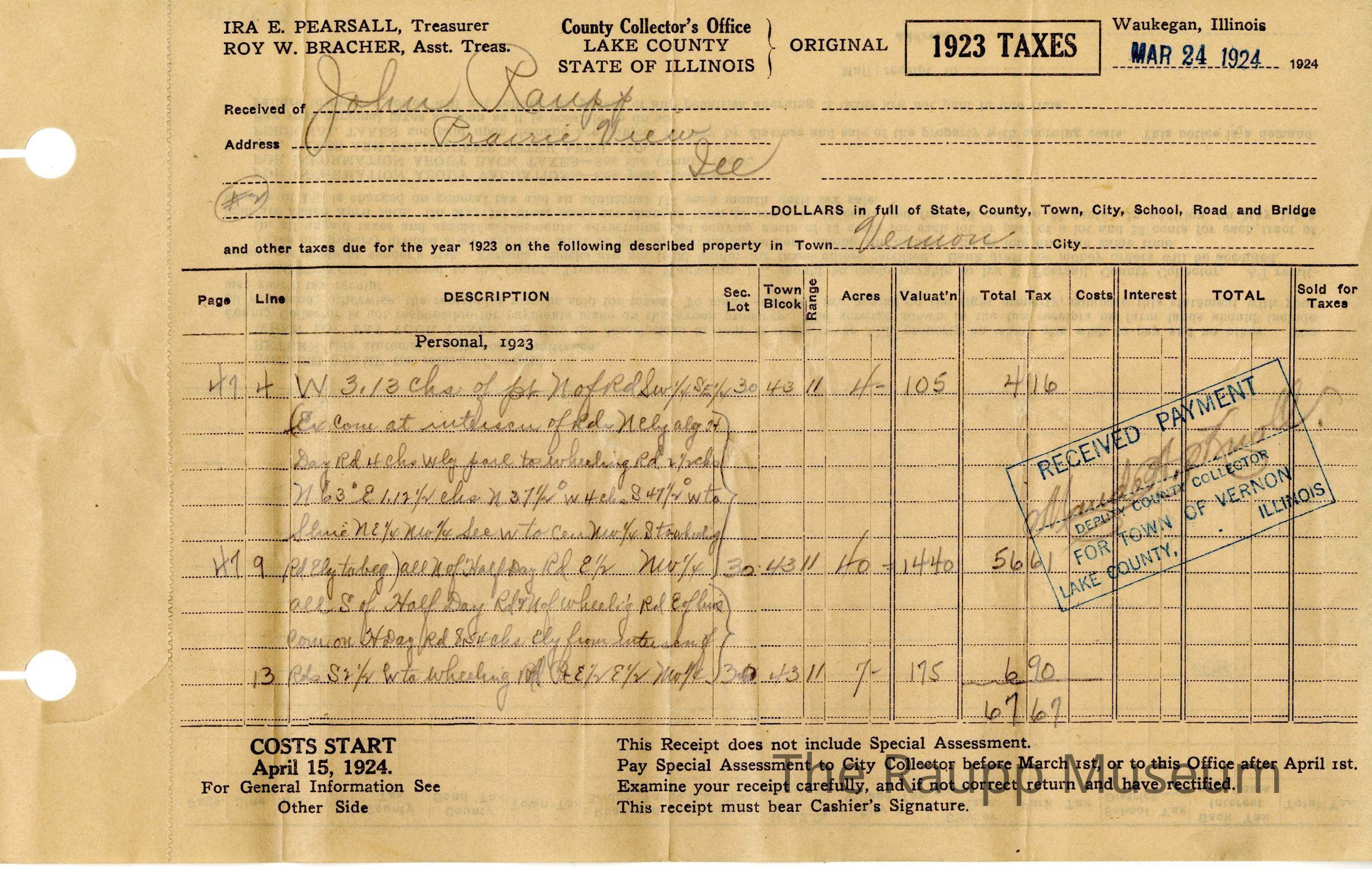 One (1) tax receipt for 1923 for John Raupp. Receipt is white, with pencil handwritten tax information. Total tax was $67.67. Stamped and signed in blue by Deputy County Collector.Archive Details