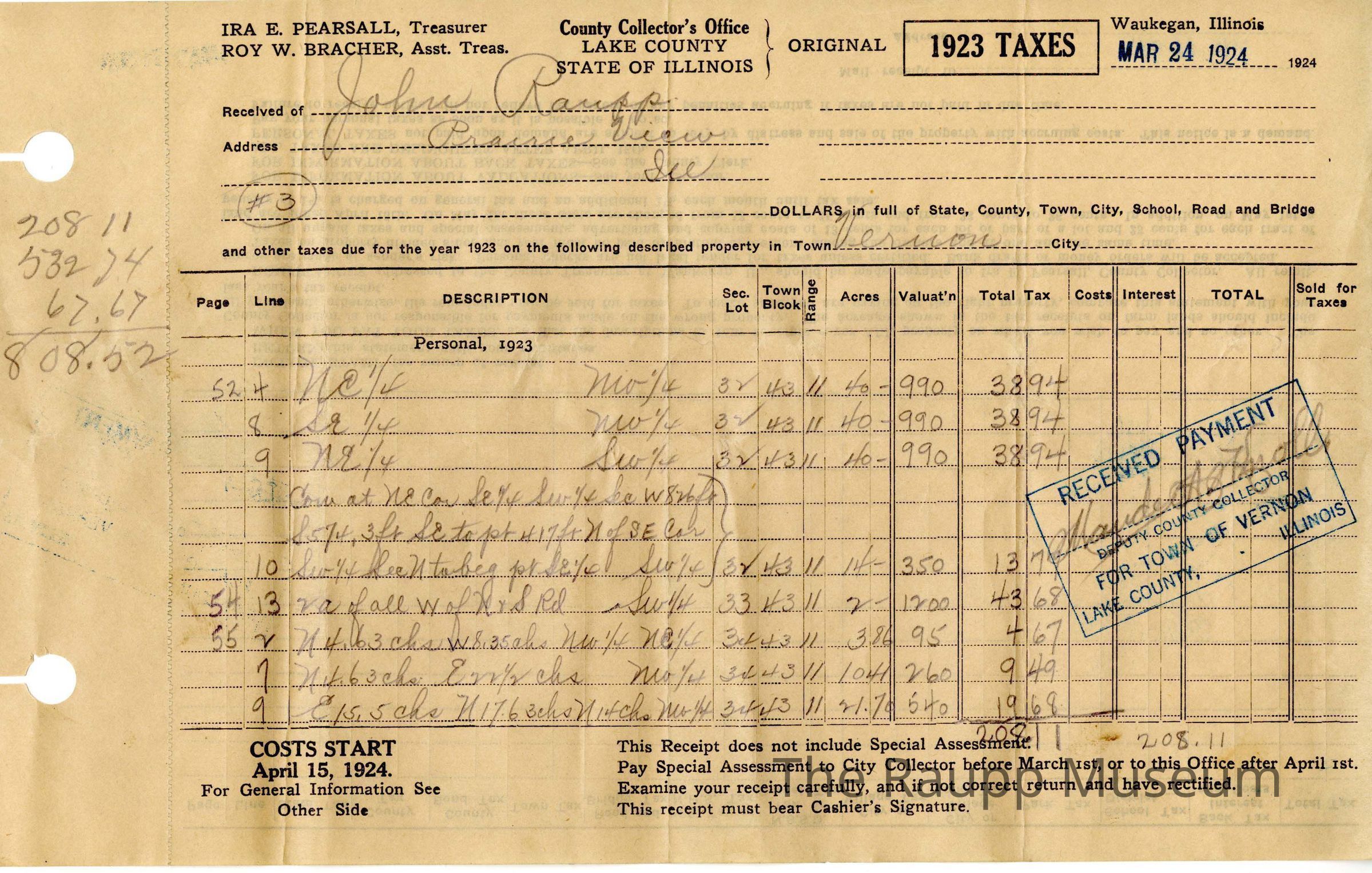 One (1) tax receipt for 1923 for John Raupp. Receipt is white, with pencil handwritten tax information. Total tax was $208.11. Stamped and signed in blue by Deputy County Collector.Archive Details