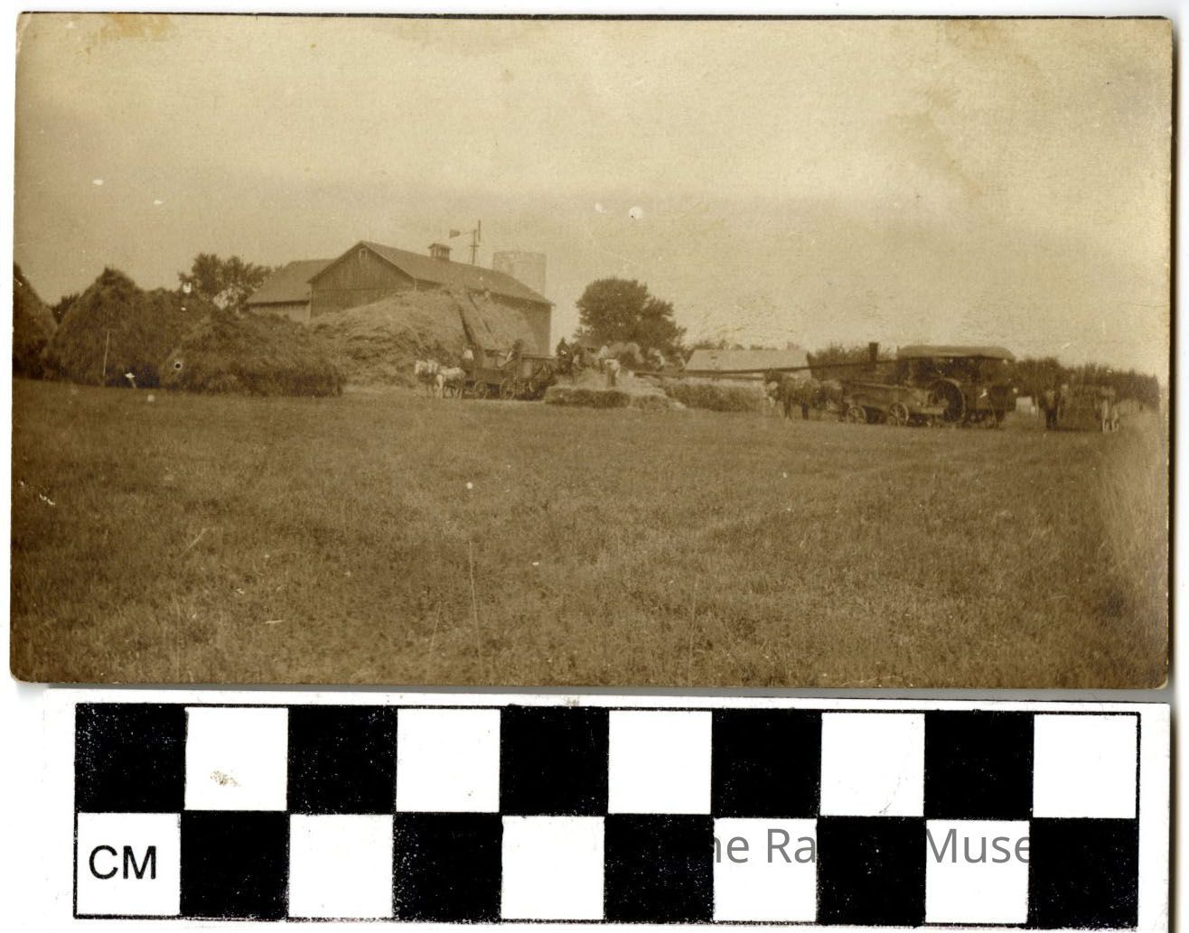 One (1) black and white photo of a farm. In the foreground are fields of grain. On the left back are stacks of grain, with a barn and silo behind them. In the center and right are two tractors and horses with hay in the middle of them. There is another smaller building bhind the hay.