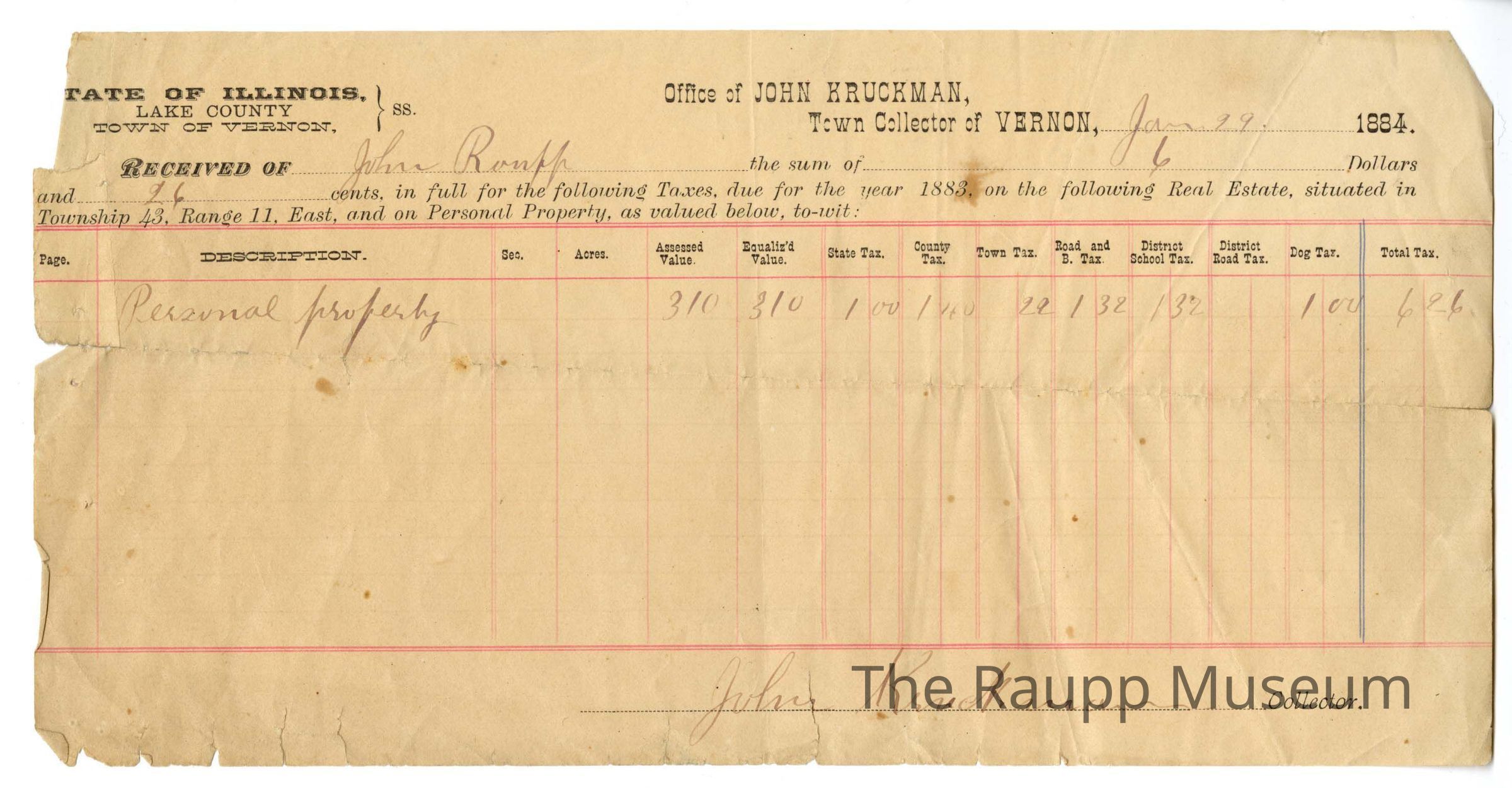 One (1) State of Illinois Property Tax receipt for John Raupp. The receipt if from the Office of John Kruckman, Town collection of Vernon and signed by John K. at the bottom. The receipt was for 6 dollars and 26 cents for the year of 1883 for his John Raupp's personal property in Township 43, Range 11, East. Information is filled in with ink, and includes property value (310), and all applicable taxes.Archive Details