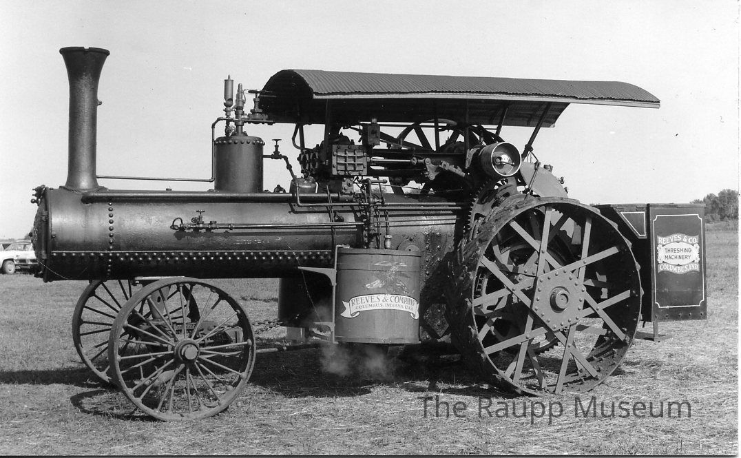 Black and white print. Image of engine, "Reeves & Company, Threshing Machinery, Columbus, Indiana, USA", cars visible in left background. On back, ink handwritten text, "Johnny Nickol's engine for threshing, Otto Nickol using it in 1912 or ''14, Aug 1975". Stamped upper left "Reeves-Eng. Cedar Falls, IA." Printed on Kodak paper.Dimensions