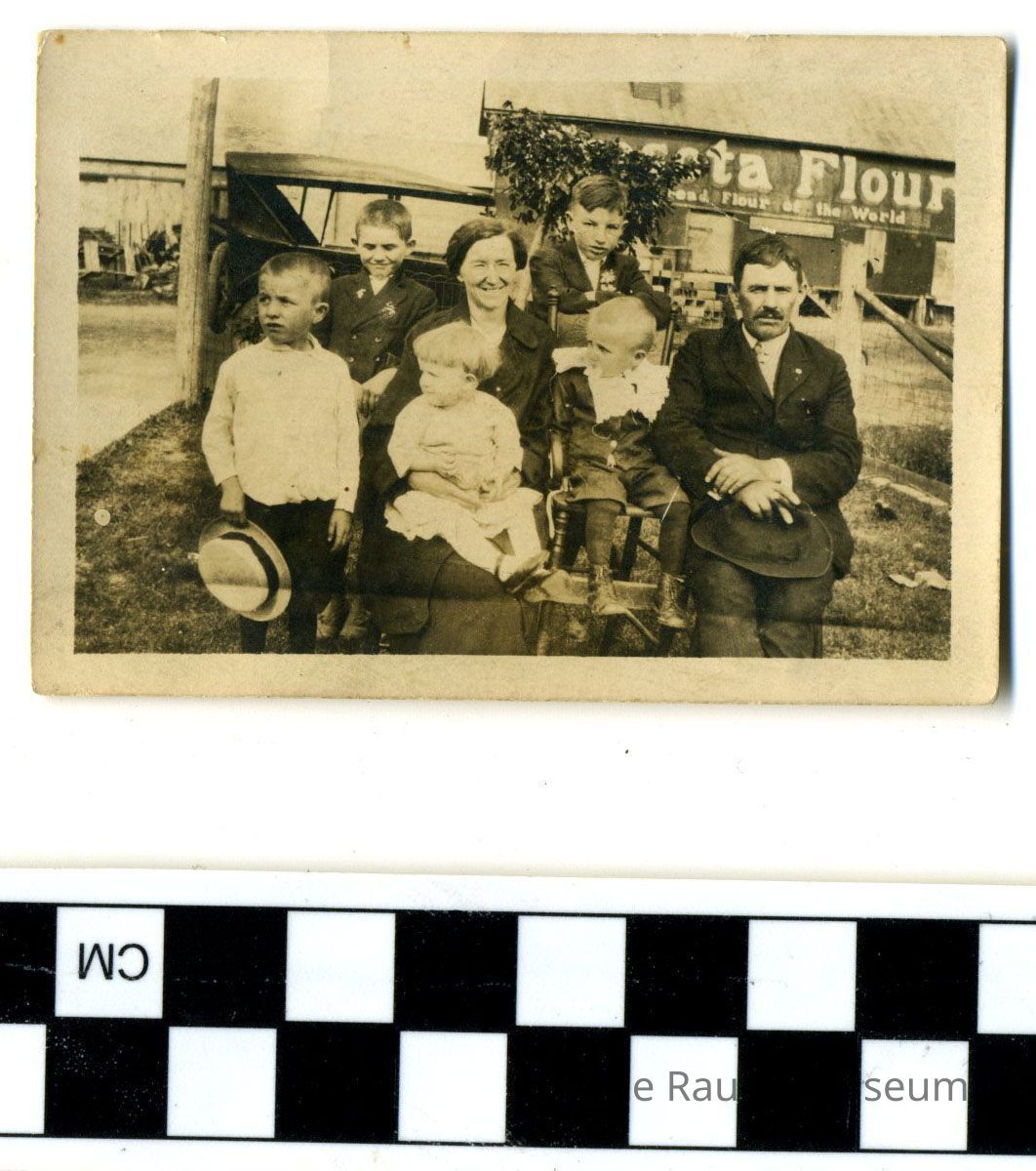 Black and white image yellowed with white border. Image of five children and their parents, Joseph Emmerich and Christine Schmit seated outside. Joseph is seated on the far right with his hat in his lap. Barn in the background has partial text: "Ceresota flour; Flour of the world." reverse side pencil text: "The Joseph Emmerich Family 1918."Dimensions