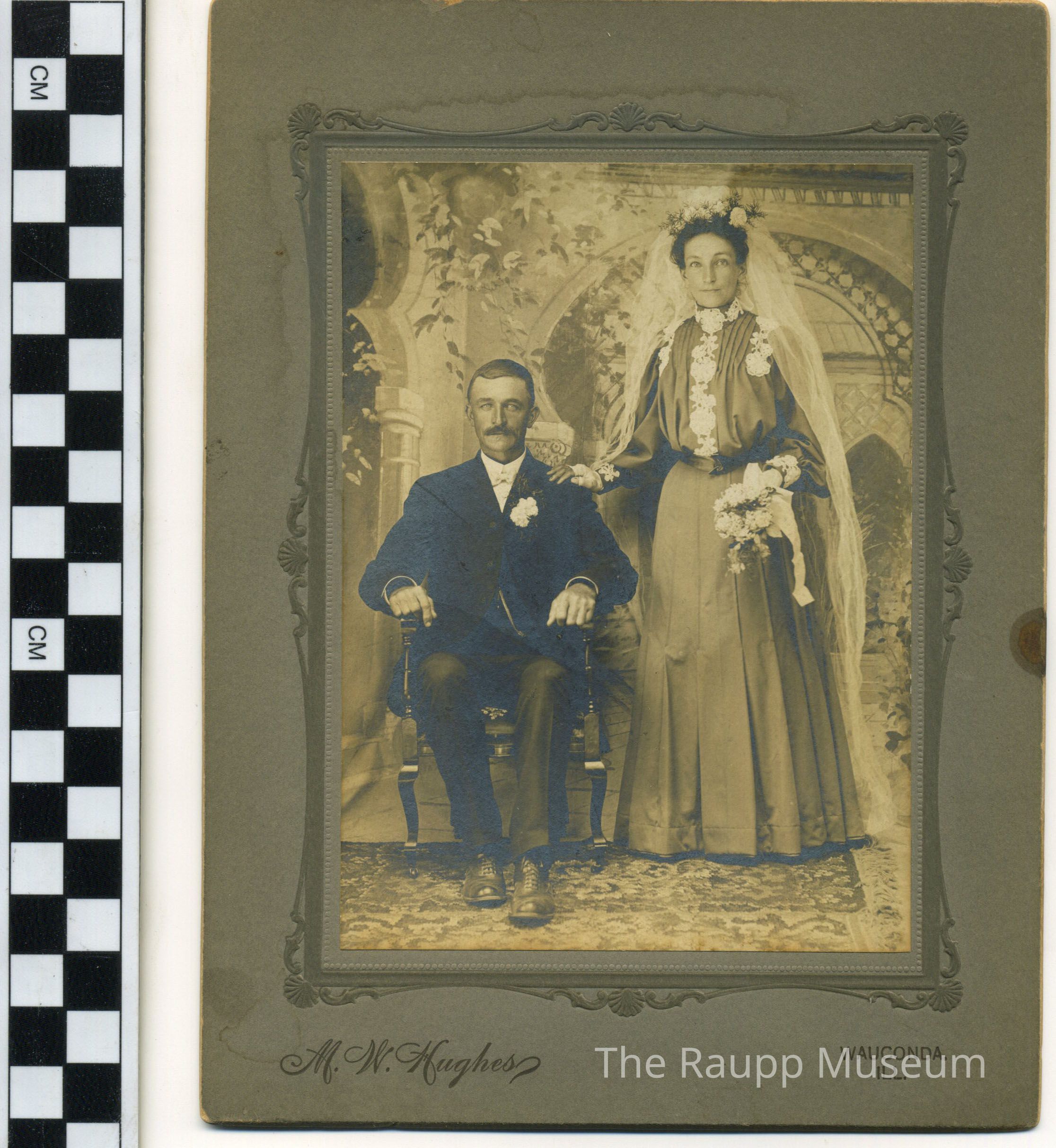 Black and white image with warm tan tones mounted to a heavy gray card with embossed scallop frame around the image. Professional wedding portrait image of Joseph Link and Margaret Hertzog. Handwritten ink text on reverse of card "Joseph Link and Margaret Hertzog."
