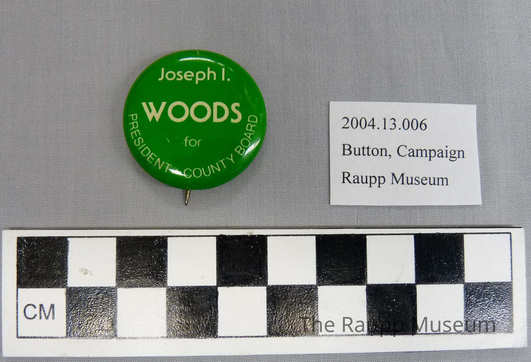 One (1) round metal campaign button with a green background and white text: "Joseph I. Woods for President County Board". The back is silver with a pin attachement.Material