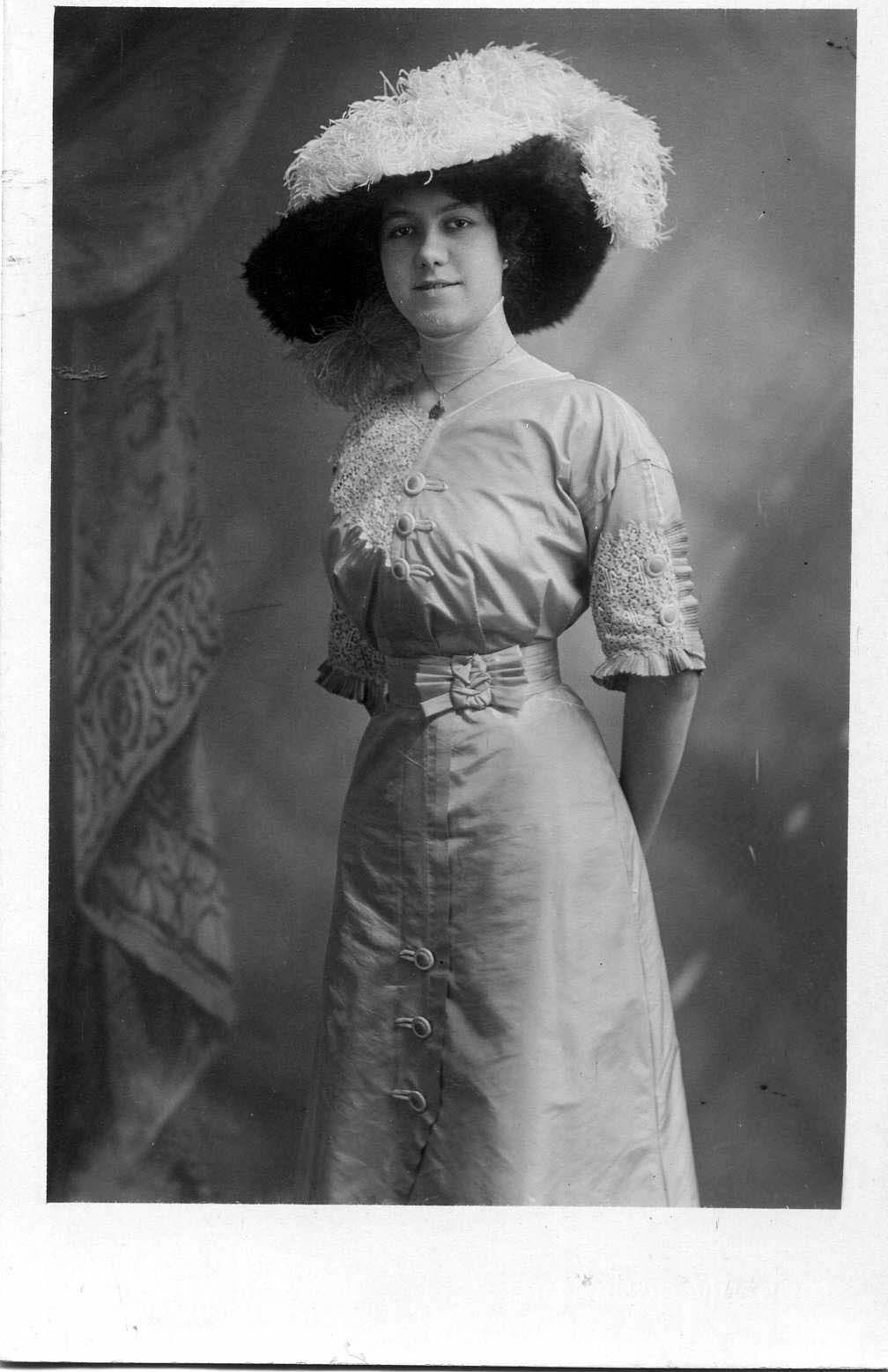 One (1) black and white photograph postcard with a white border. Picture on front has a women standing in a white dress with ribbon belt and lace decoration on the left arm and right shoulder. Three buttons on top and bottom of dress. She is wearing a hat with a dark fabric underneath and large white feathers on top. There is a curtain behind her.