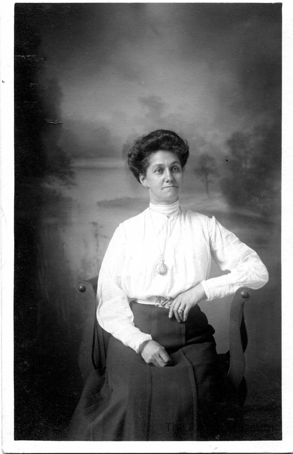 One (1) black and white photograph with white border. The photo is of Josephine Vokinger Hoenner, mother of Josephine Hoenner Welter. Woman is sitting in a chair looking to the right with elbow resting on the chair arm. She is wearing a white blouse and long dark skirt. The background is a manufactured lake and tree scene. Back of card has printed: "Post Card Correspondence here, Name and Address here, Place Stamp here". Printed on the left side is: "W.A. Heaton, Photographer, 307 Jefferson St., Joliet, ILL Chicago Phone 2553." Handwritten in ink on back: "Great Grandma Hoenner of Deb and Chuck."Dimensions
