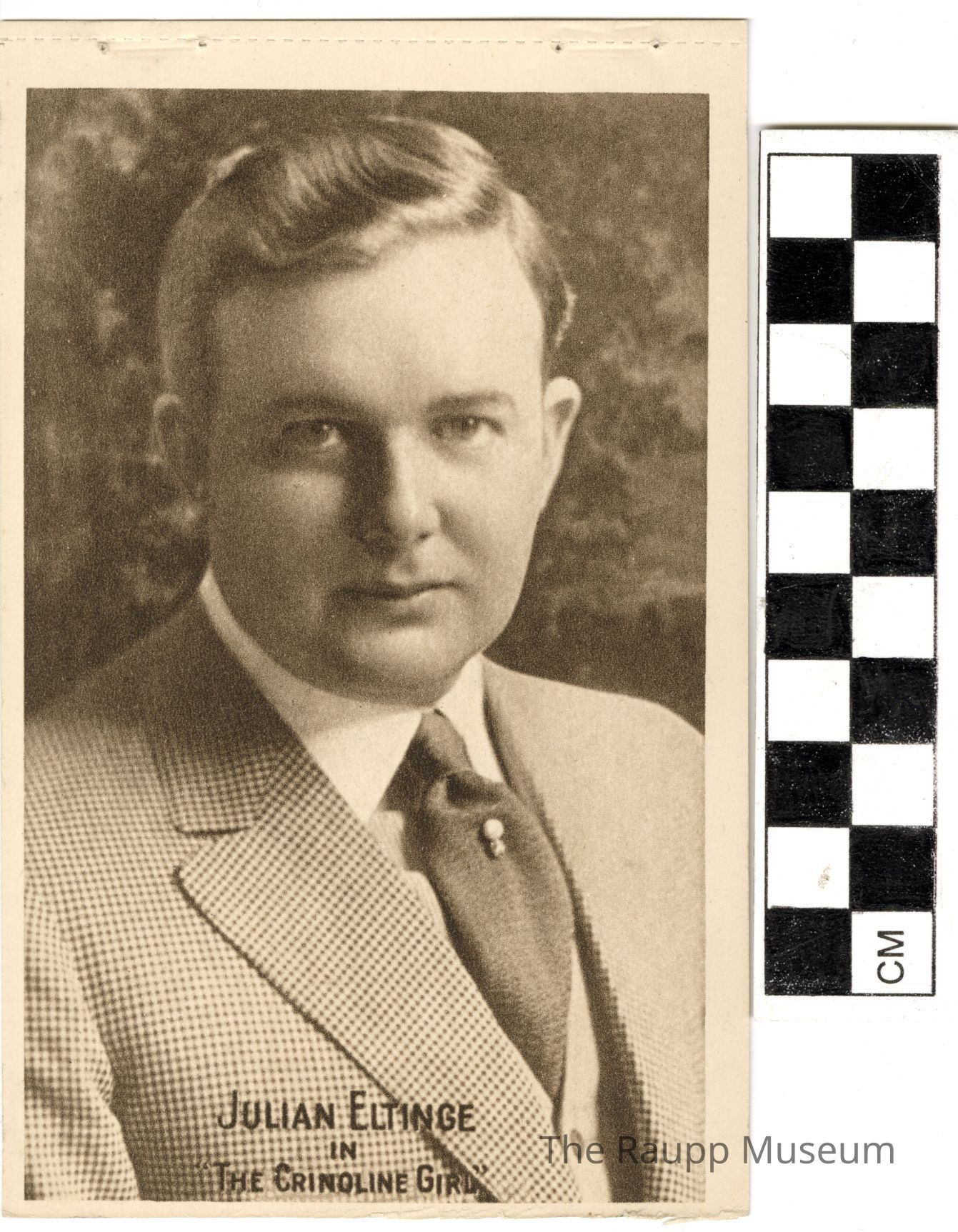 One (1) beige postcard with a black and white photo on the front of a man facing the camera from the waist up, in a checkered suit, white undershirt, and dark tie with a pin. He has light colored hair pushed back and a dark background behind him. On the bottom is printed: "Julian Eltinge in The Crinoline Girl".