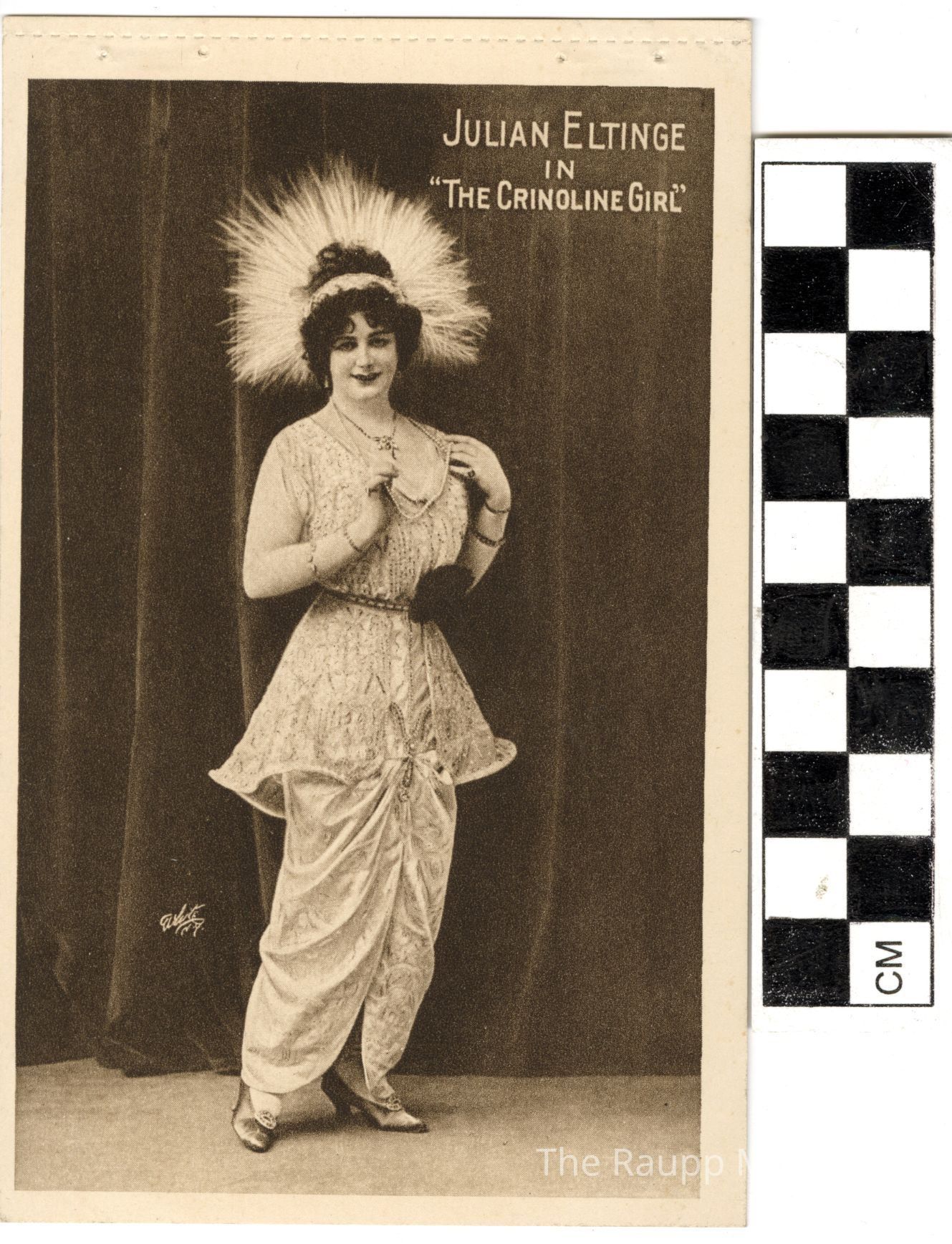 One (1) beige postcard with a black and white photo on the front of a woman in a sleeveless decorated white top and pants with pearls and dark hair with a feather headpiece on. On the bottom is printed: "Julian Eltinge in The Crinoline Girl".