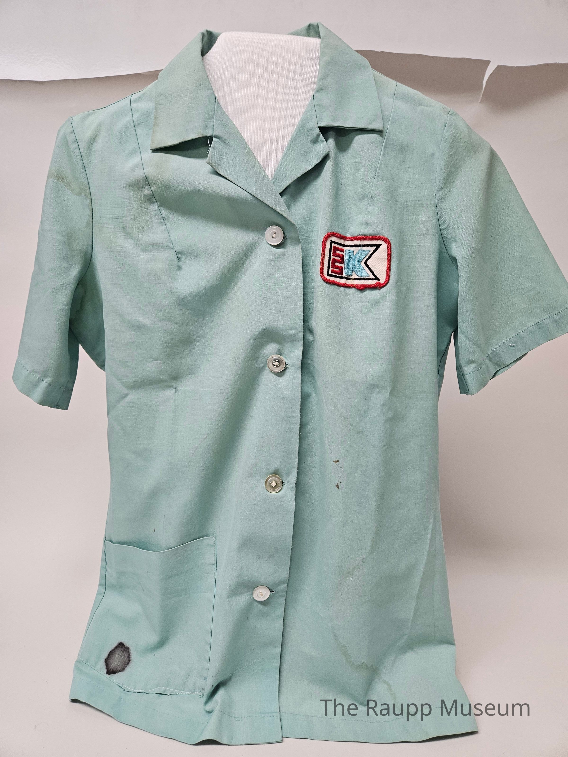 One (1) blue K-Mart short-sleeve work shirt from the 1970s. Shirt is short sleeve with a collar. There are 4 white buttons that button the shirt closed down the front. The two middle buttons match with 4 holes each, but the top and bottom button are different from the rest - the top button has 2 holes and is a solid white, the bottom button is slightly opaque white and has 2 holes. There is a red and blue square KMart logo patch on the left chest. The patch has a red border, with a red stacked "SS" shape and a blue "K" next to it, encased in a black line border. There is a white label on the top inside that states "Shane Permanent Press L-65557, 65% polyester, 35% cotton, 10-12, 1239 4961(?)". There is a pocket on the bottom right front of the shirt.Relationships