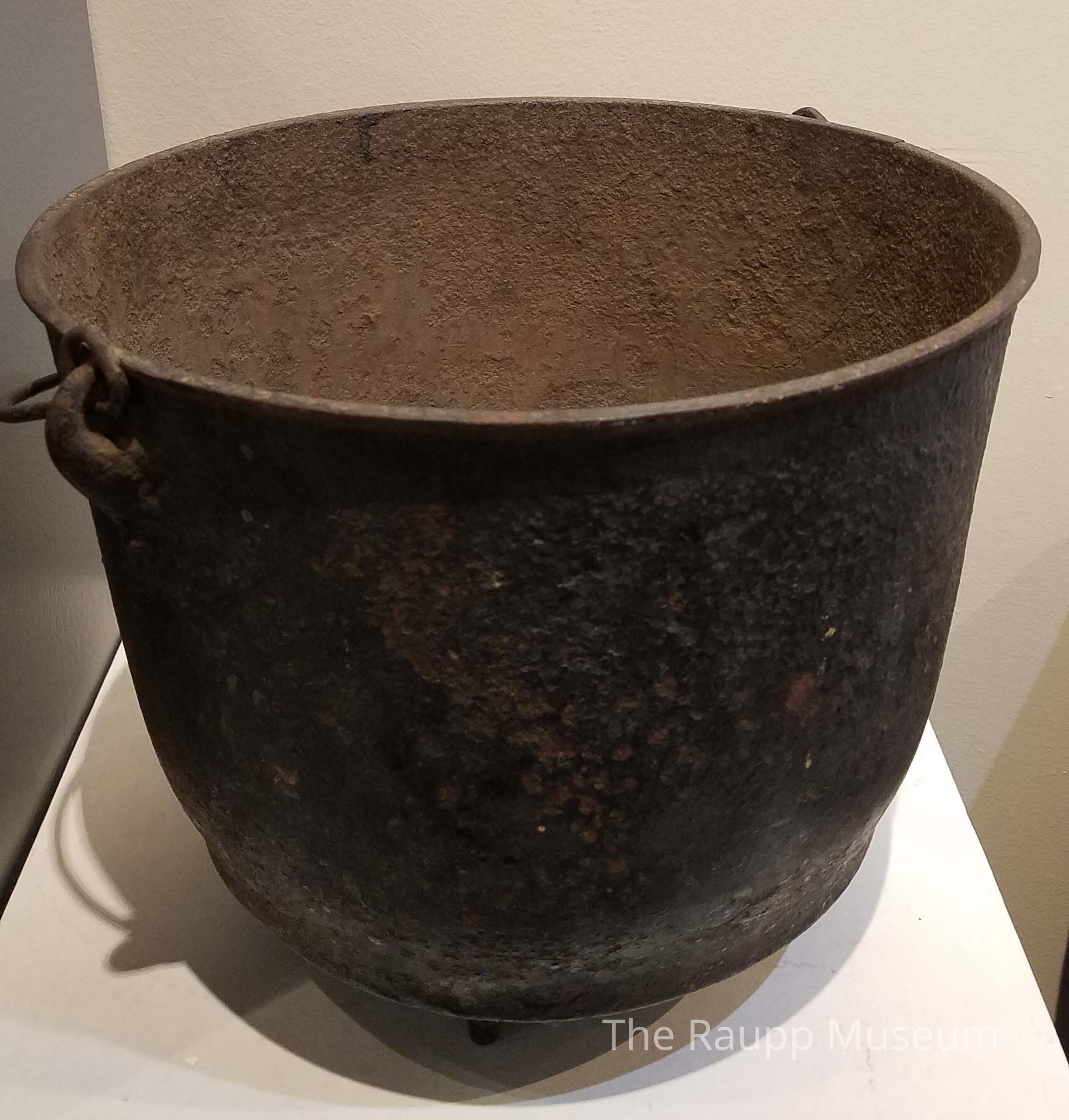 One (1) black and brown cast iron kettle pot with 3 pointed feet on bottom and metal handle to hang pot over the fire. Middle of handle is flat, while rest is curved. Handle locks into the sides on protruding notches. Bottom is rounded but has a thin rim. Top also has slight rounded rim. Body of pot is about the same thickness throughout, except for very bottom.Dimensions