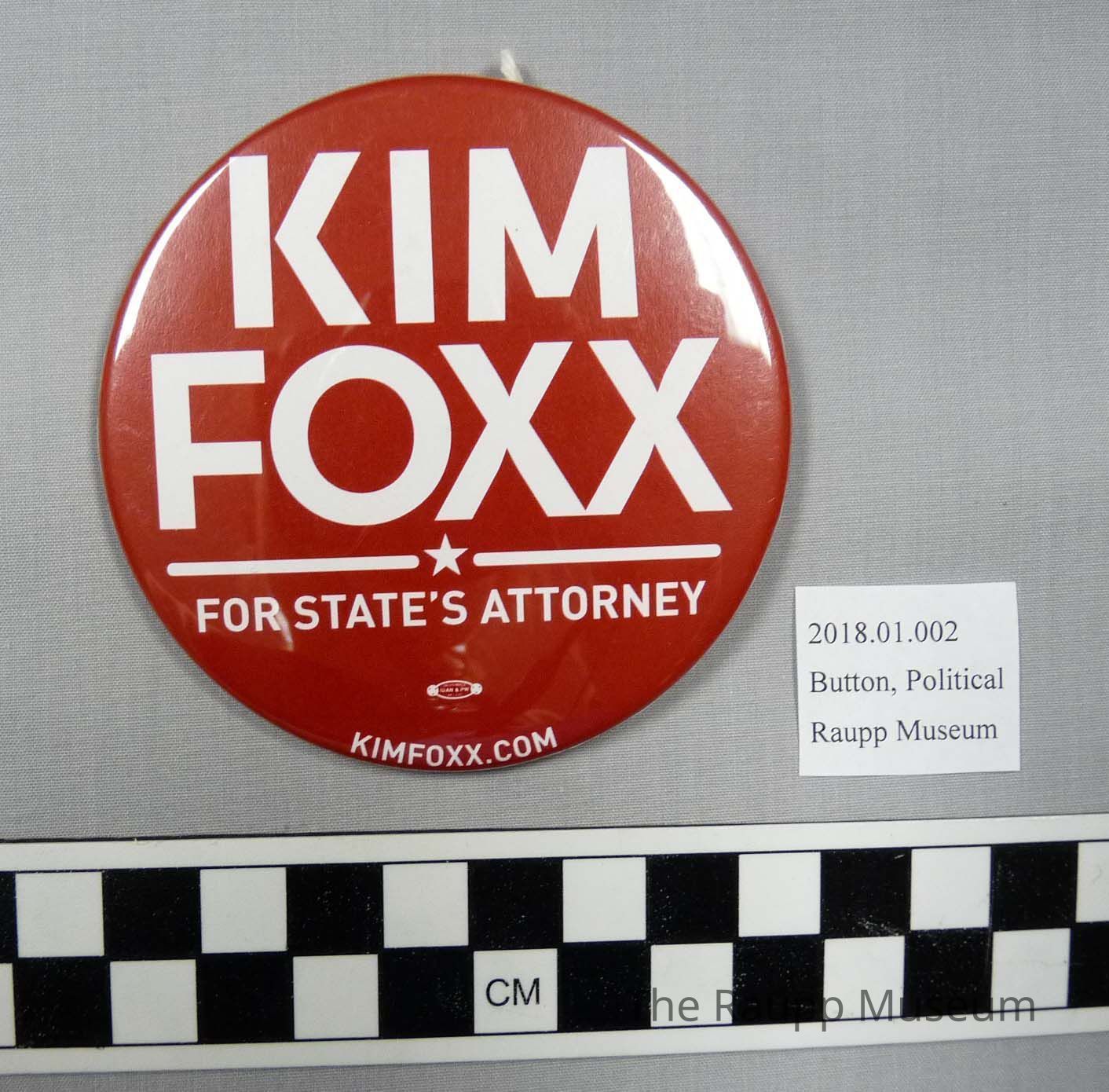 One (1) political button. Button is round and red on one side, silver on the other. Message: "Kim Foxx for State's Attorney, kimfoxx.com" and "Paid for by Friends for Foxx" written on side. There is a safety pin style pin on the back.Condition