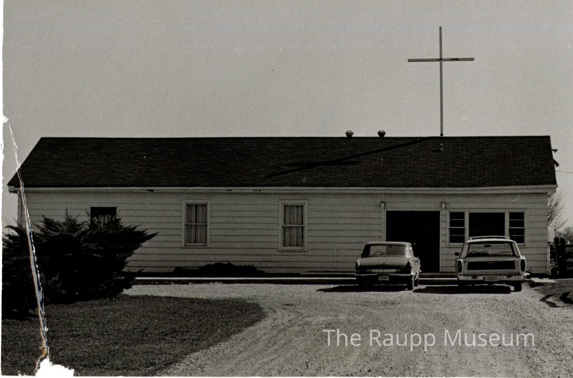 One (1) black and white photograph of Kingswood United Methodist Church in circa 1968. Photo shows a one-story rectangular building with white horizontal slating and a dark colored angled roof. In the middle of the right half of the roof, there is an unadorned cross made of two (metal) strips. Two cards are parked in front of the front door, under the cross, on the gravel driveway. The gravel driveway continues to the left of the photo. There is a grass patch on the left corner, with a large bush on the left side.