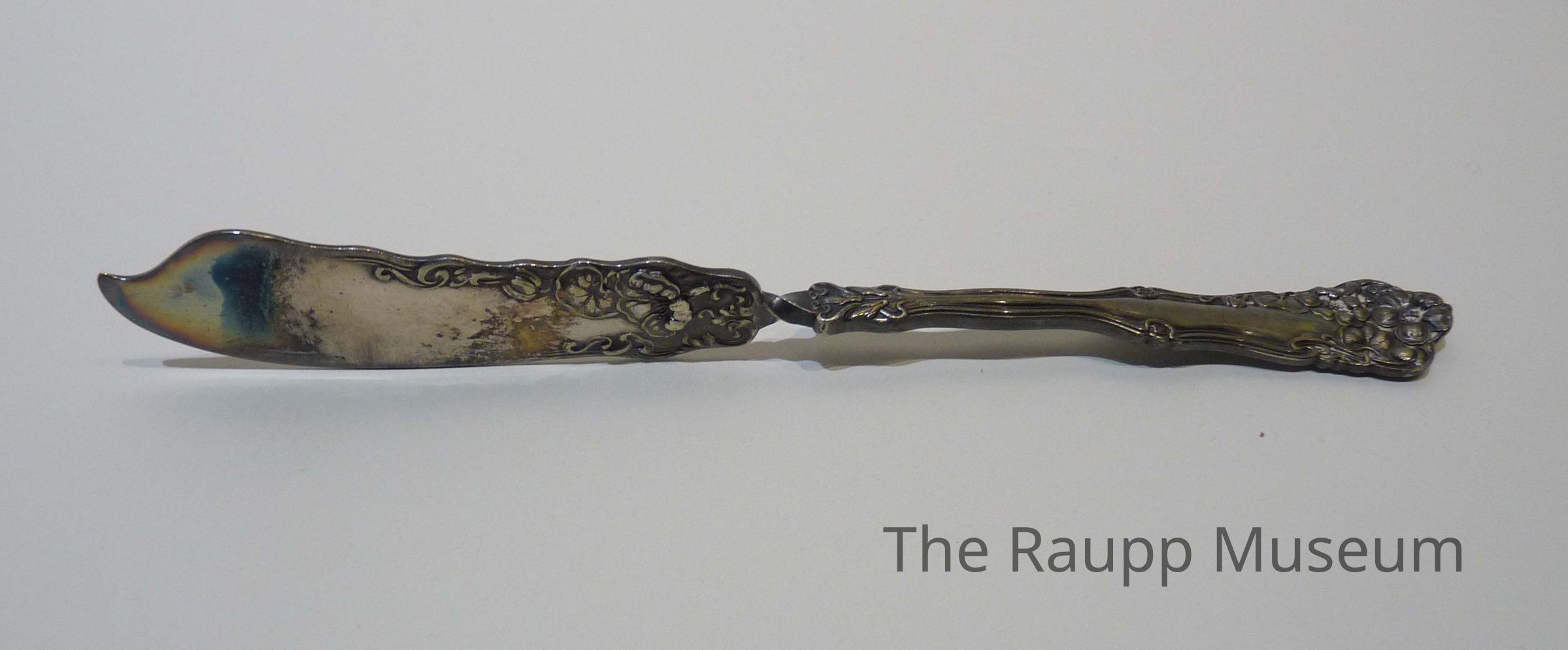 One (1) silver butter knife. Knife has handle set perpendicular to knife blade (as if straight knife was twisted 90 degrees), flower pattern at top of handle and on both sides of blade where blade joins handle. Pattern on blade shows front pattern on one side, back pattern on other side. Knife blade comes to a curvy point. On inside of handle is marked: "Pat. 1904, WM Rogers" and a calligraphy "C. G"Dimensions