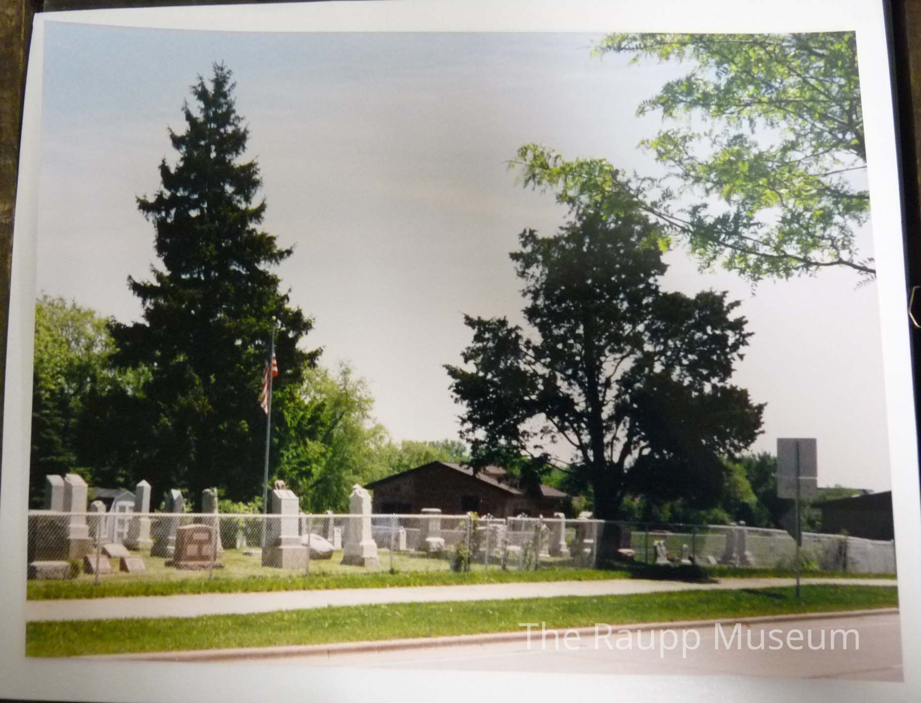 One (1) color photograph of Knopf Cemetery. Picture is taken across the street and shows two large trees, a square brick building, flag pole with American flag, and grave stones. Photo is attached to a cardboard white backing, in a wooden frame.Made/Created